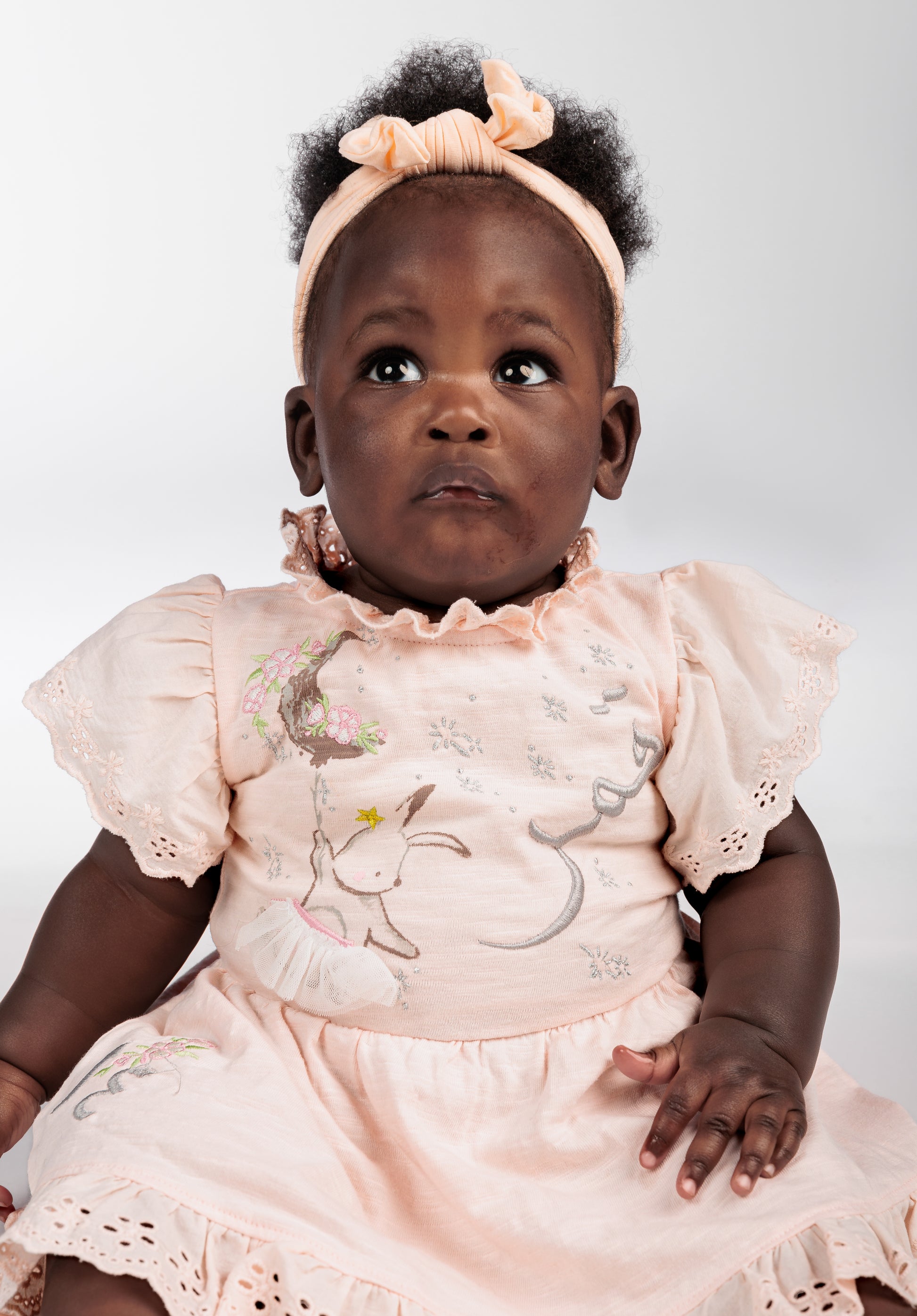 فستان باللون الوردي الدافئ مصنوع من القطن العضوي المحبوك! يتميز بلمسات من الكروشيه الناعم حول الرقبة والأكمام والحافةِ السفلية بالإضافة لتفاصيل وطبعة ظريفة موزعة جنباً إلى جنب مع تطريز باللون الفضي لكلمة "قمر" ورقم "14" باللغة العربية، لتظهر طفلتك كقمر14! متوفر بمقاسات مختلفة.