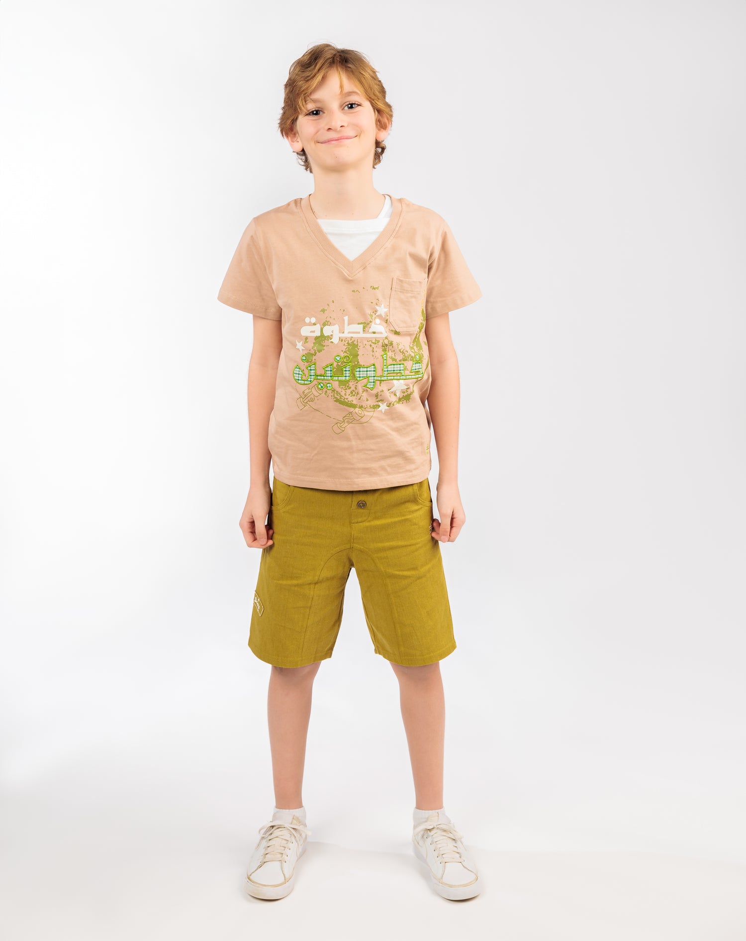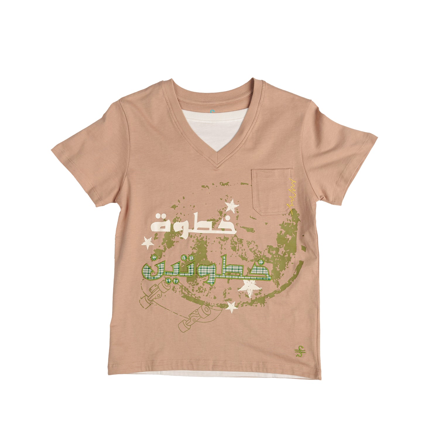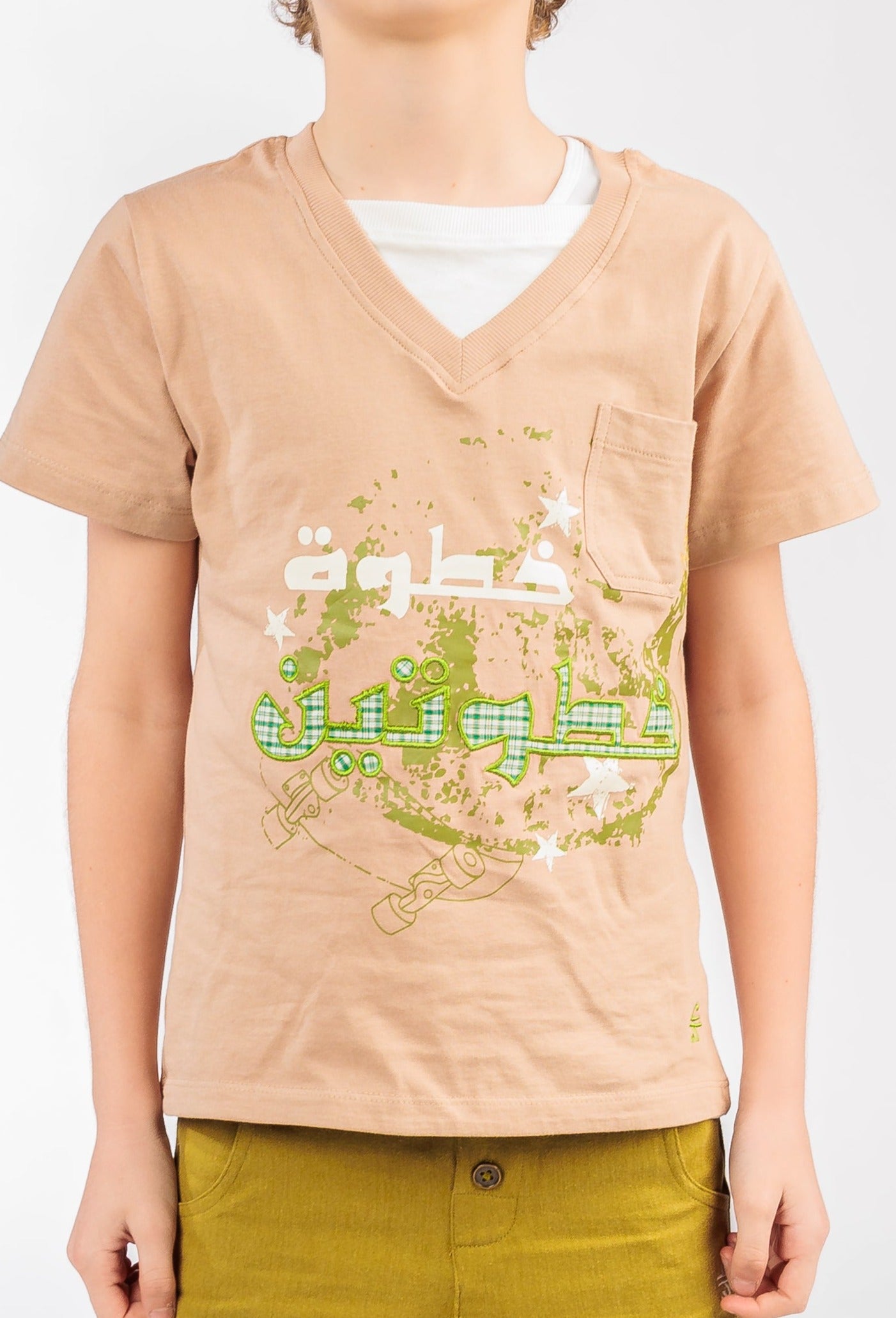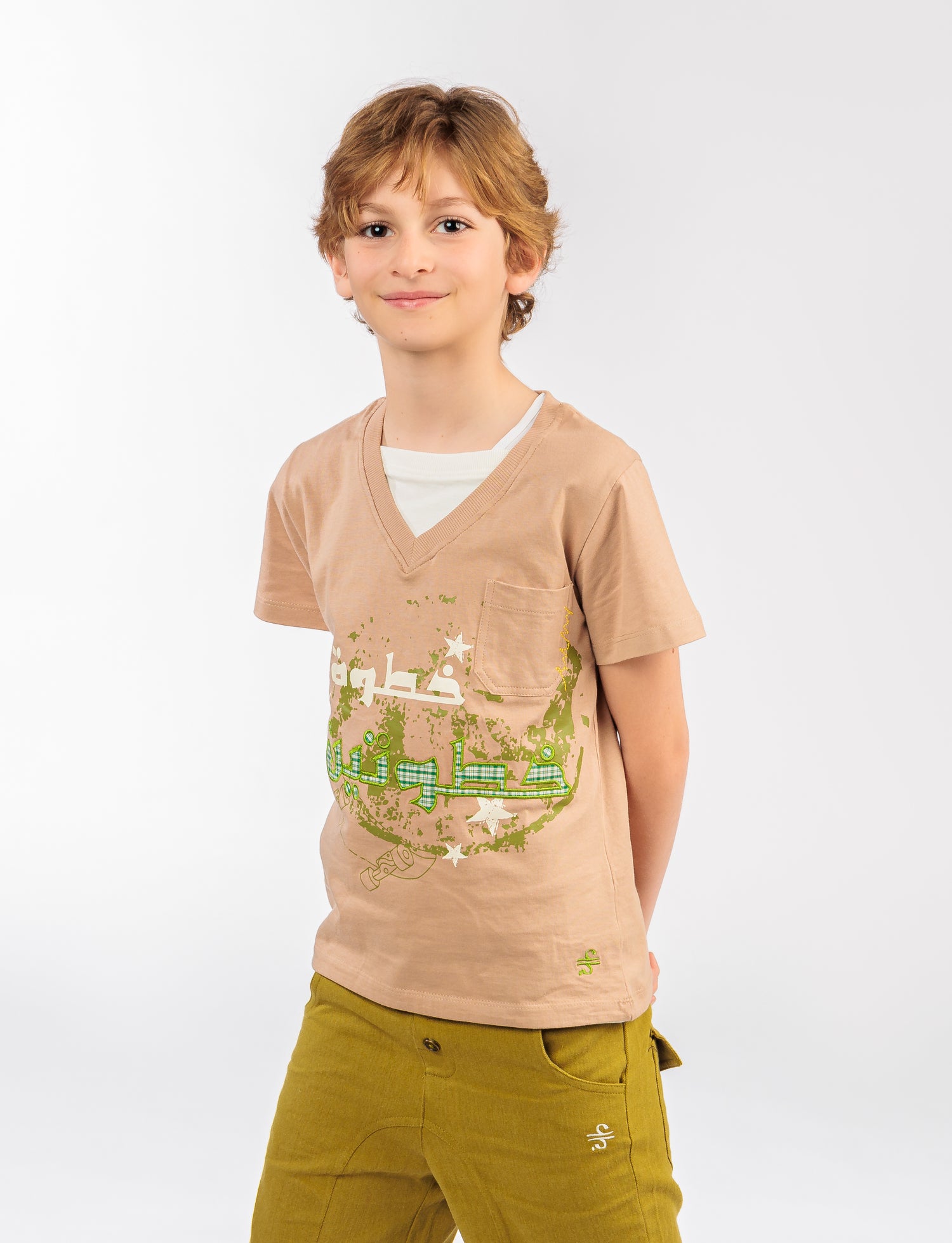 تيشيرت بني فاتح مصنوع 100%من قماش الجيرسيه من القطن العضوي، يتميز بتطريزٍ للعبارة التحفيزية "خطوة خطوتين وعلى مهلك" مع رسومات حماسية تتباين ما بين الأخضر والأبيض والبني الفاتح لتعكس الشخصية الهادئة المُفكرة. يمكن تنسيقه مع بنطلون "بشويش" من نفس المجموعة.