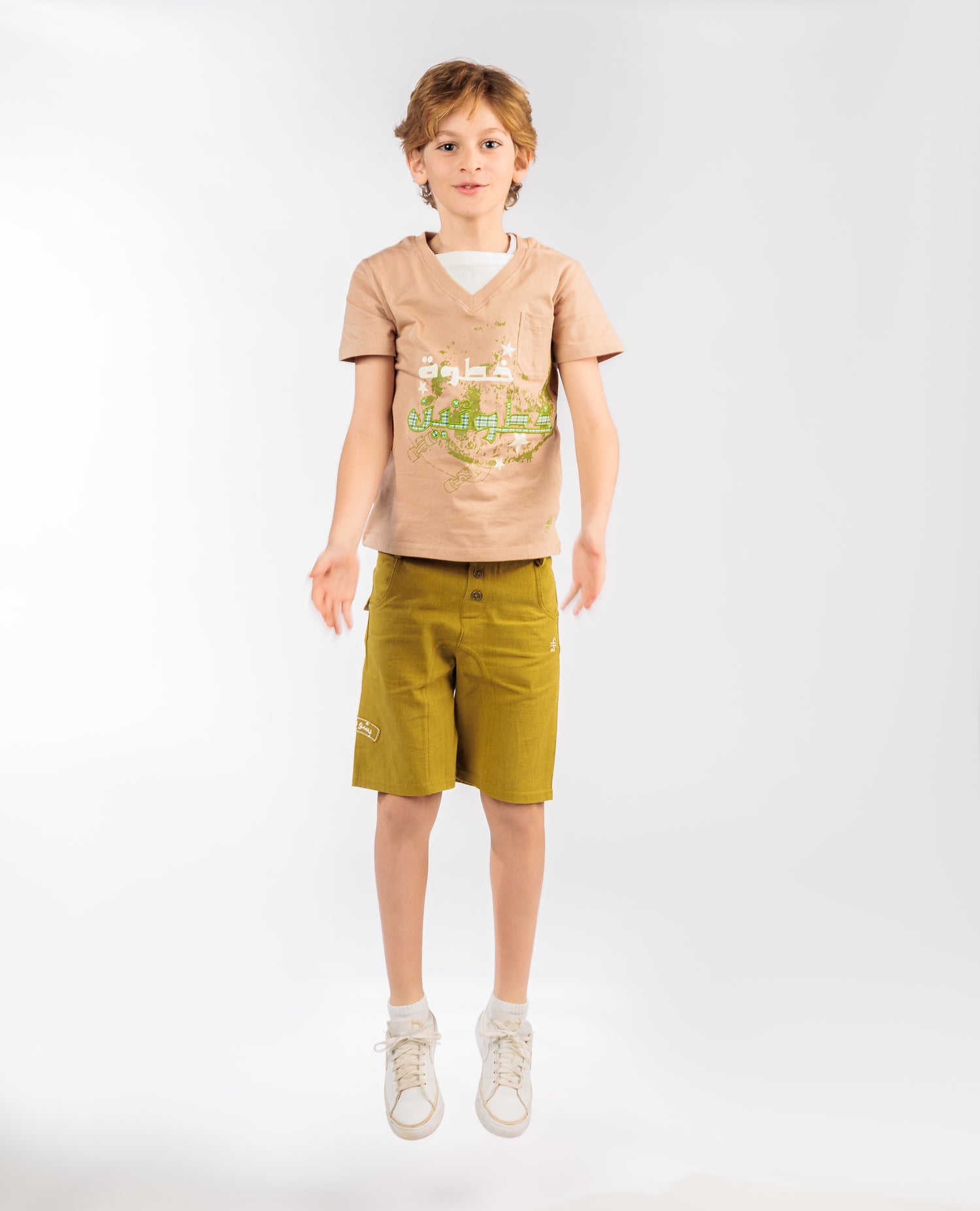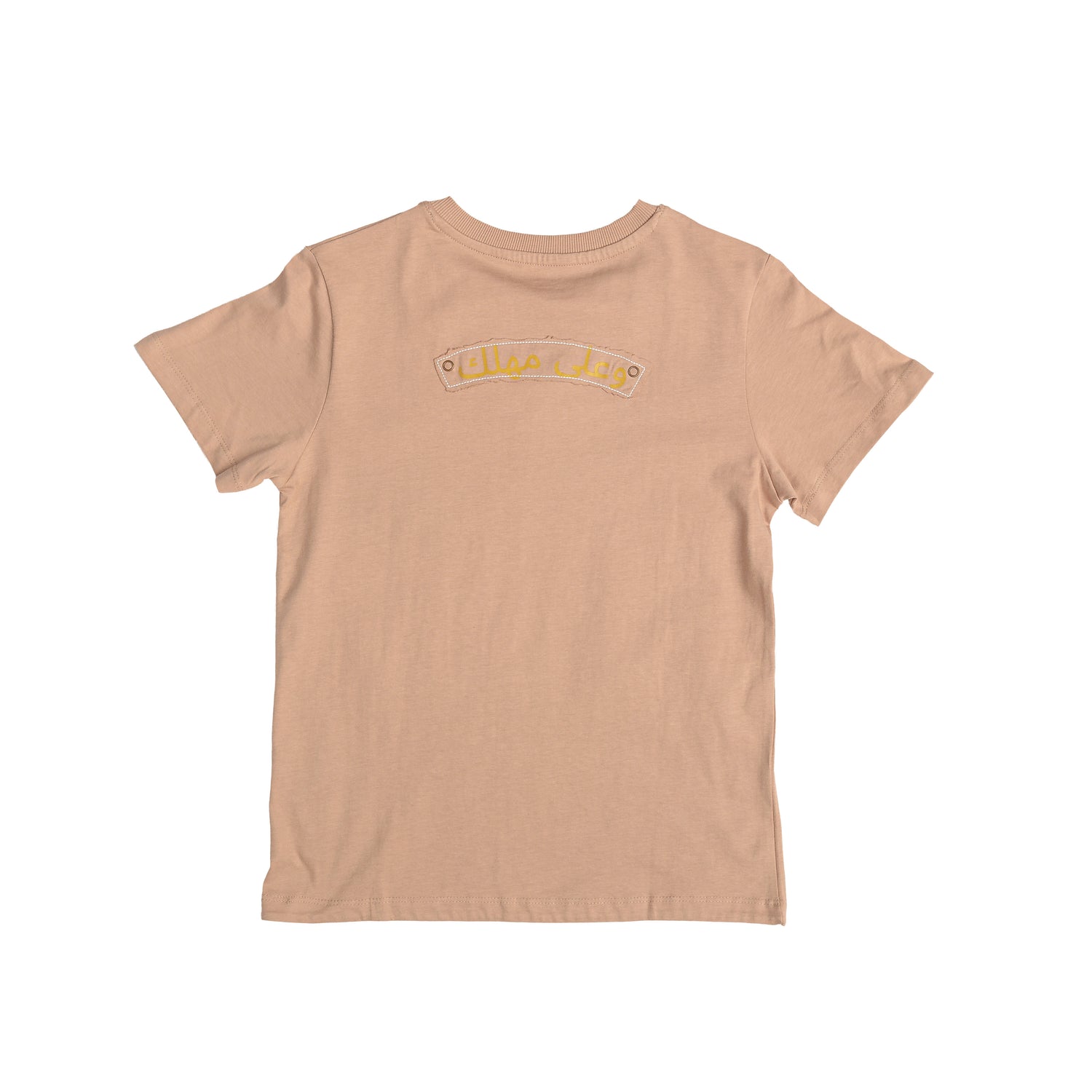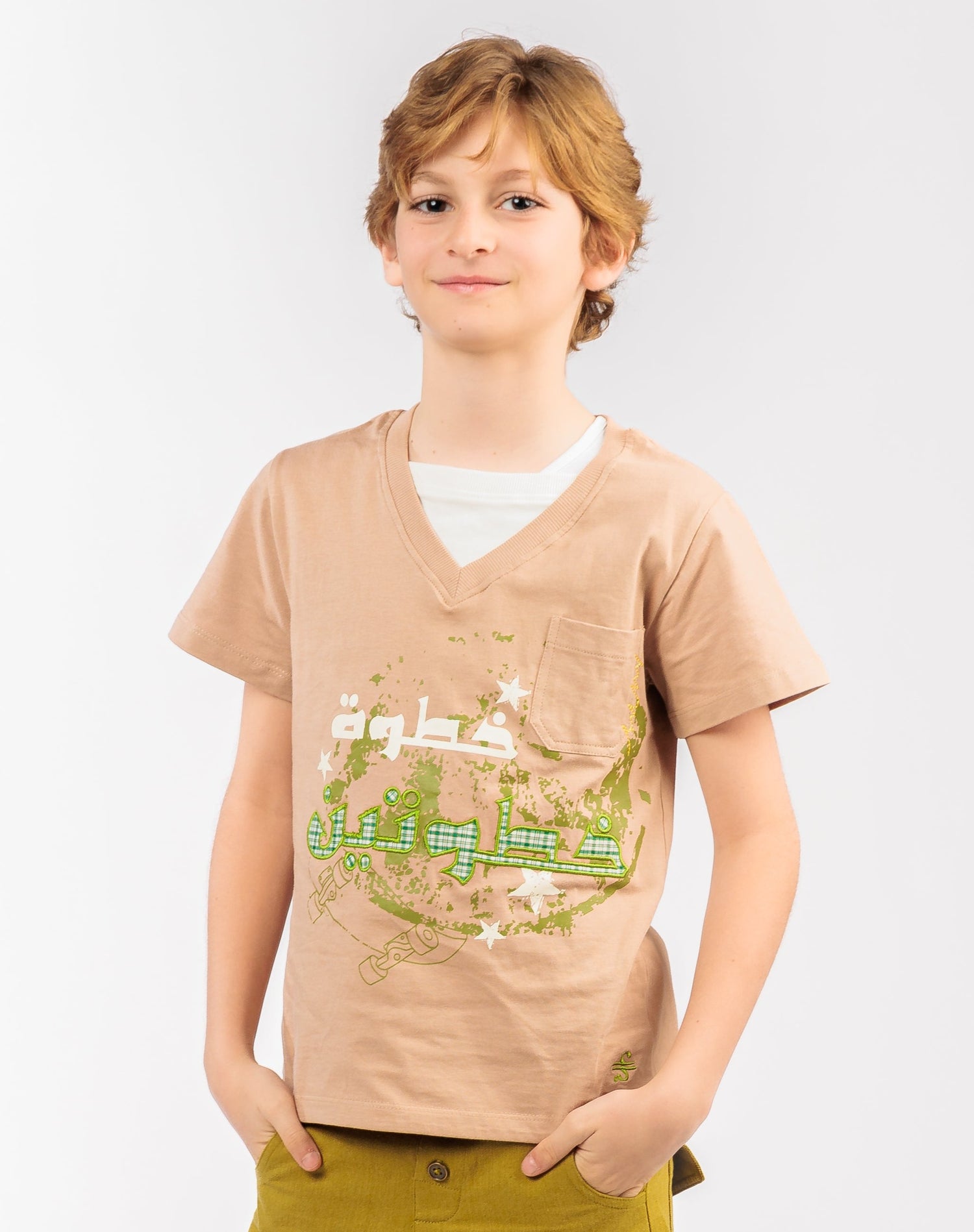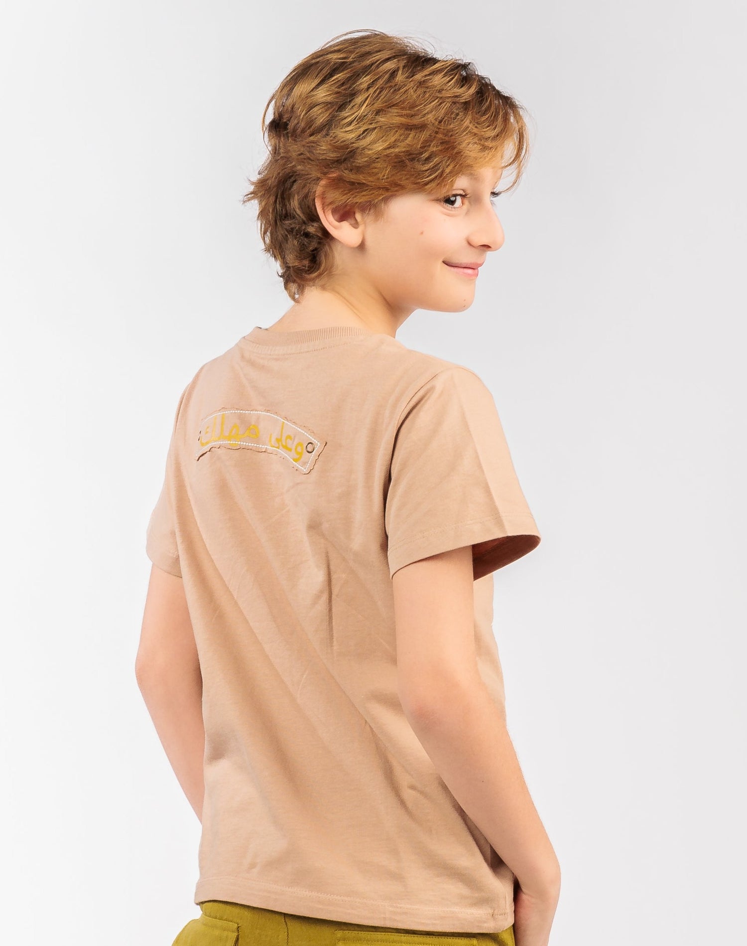 تيشيرت بني فاتح مصنوع 100%من قماش الجيرسيه من القطن العضوي، يتميز بتطريزٍ للعبارة التحفيزية "خطوة خطوتين وعلى مهلك" مع رسومات حماسية تتباين ما بين الأخضر والأبيض والبني الفاتح لتعكس الشخصية الهادئة المُفكرة. يمكن تنسيقه مع بنطلون "بشويش" من نفس المجموعة.