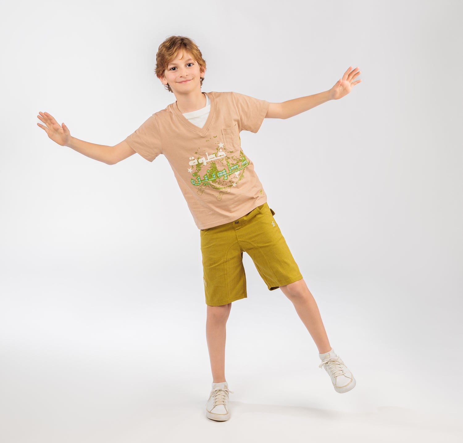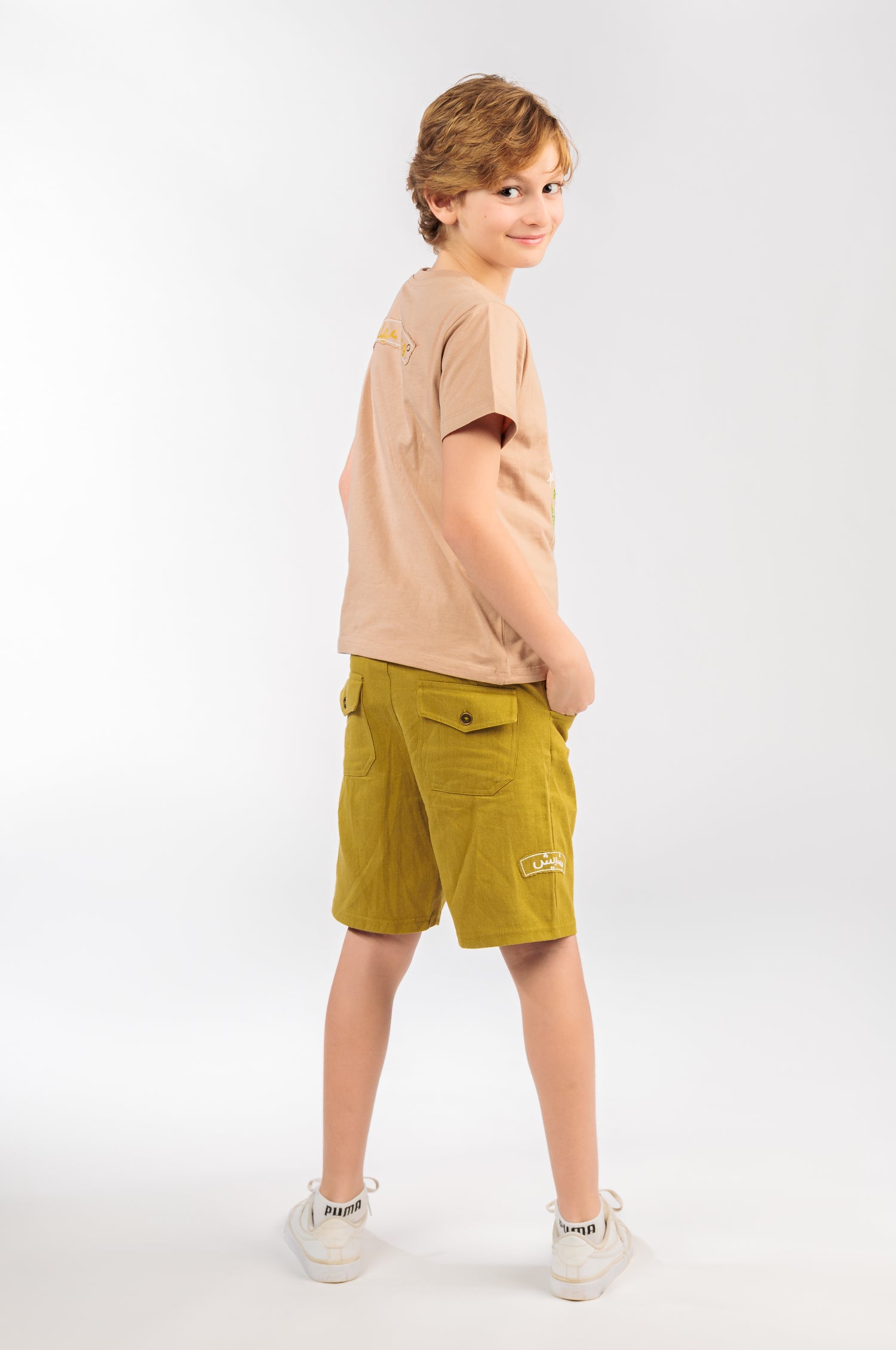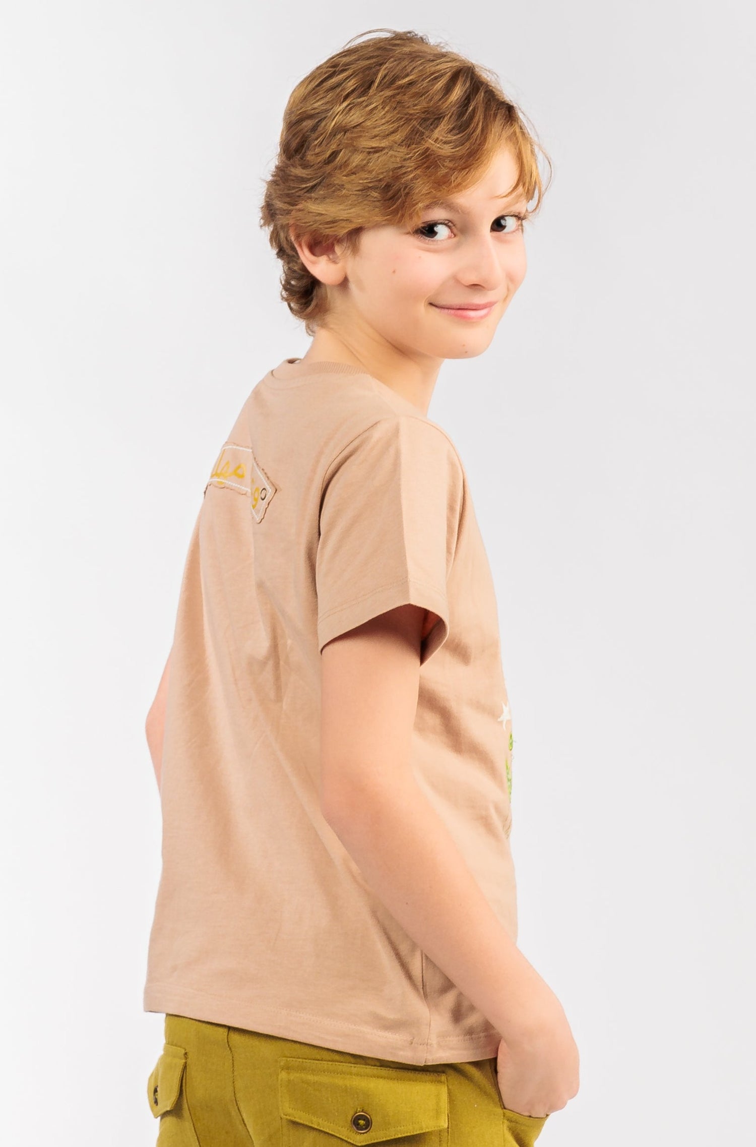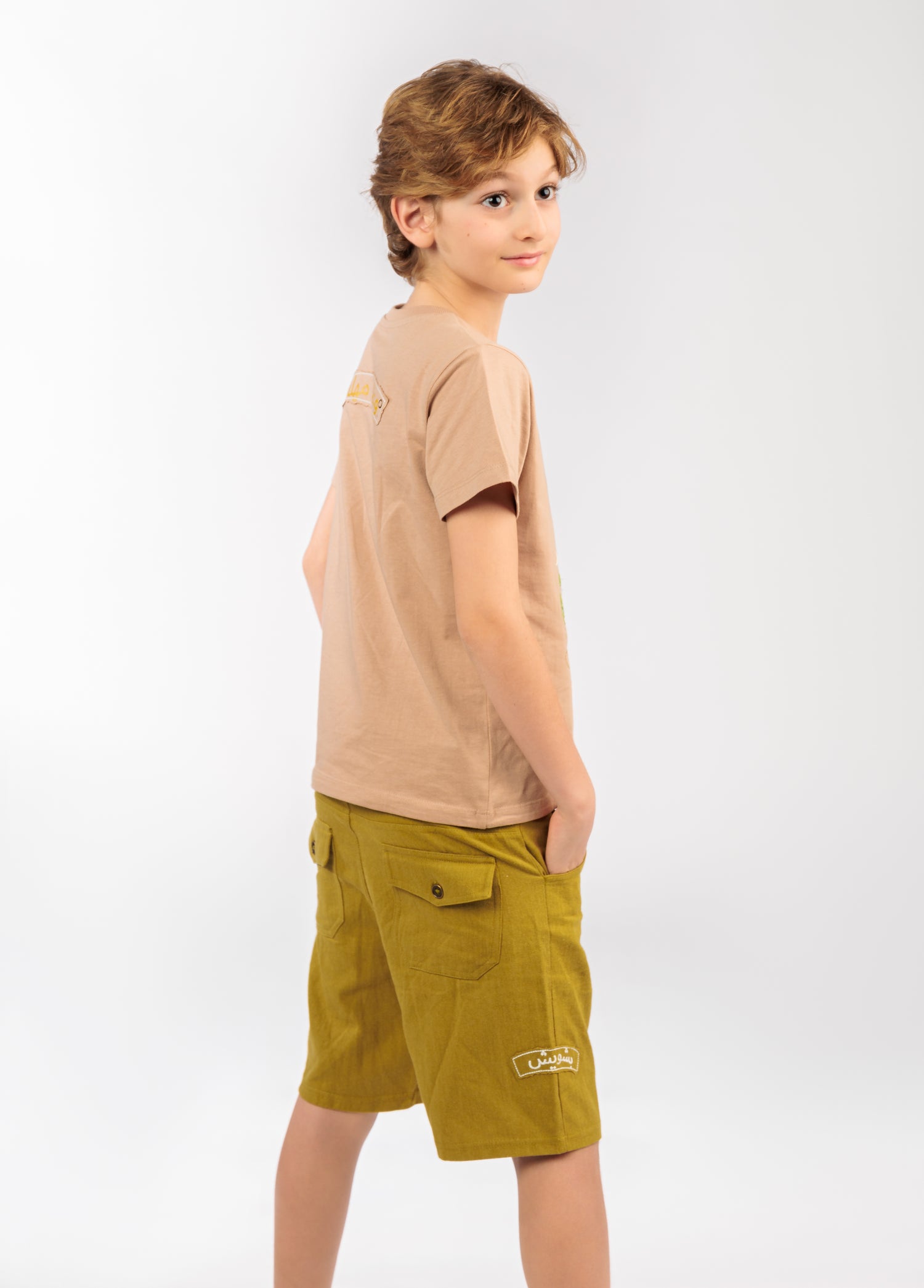 تيشيرت بني فاتح مصنوع 100%من قماش الجيرسيه من القطن العضوي، يتميز بتطريزٍ للعبارة التحفيزية "خطوة خطوتين وعلى مهلك" مع رسومات حماسية تتباين ما بين الأخضر والأبيض والبني الفاتح لتعكس الشخصية الهادئة المُفكرة. يمكن تنسيقه مع بنطلون "بشويش" من نفس المجموعة.