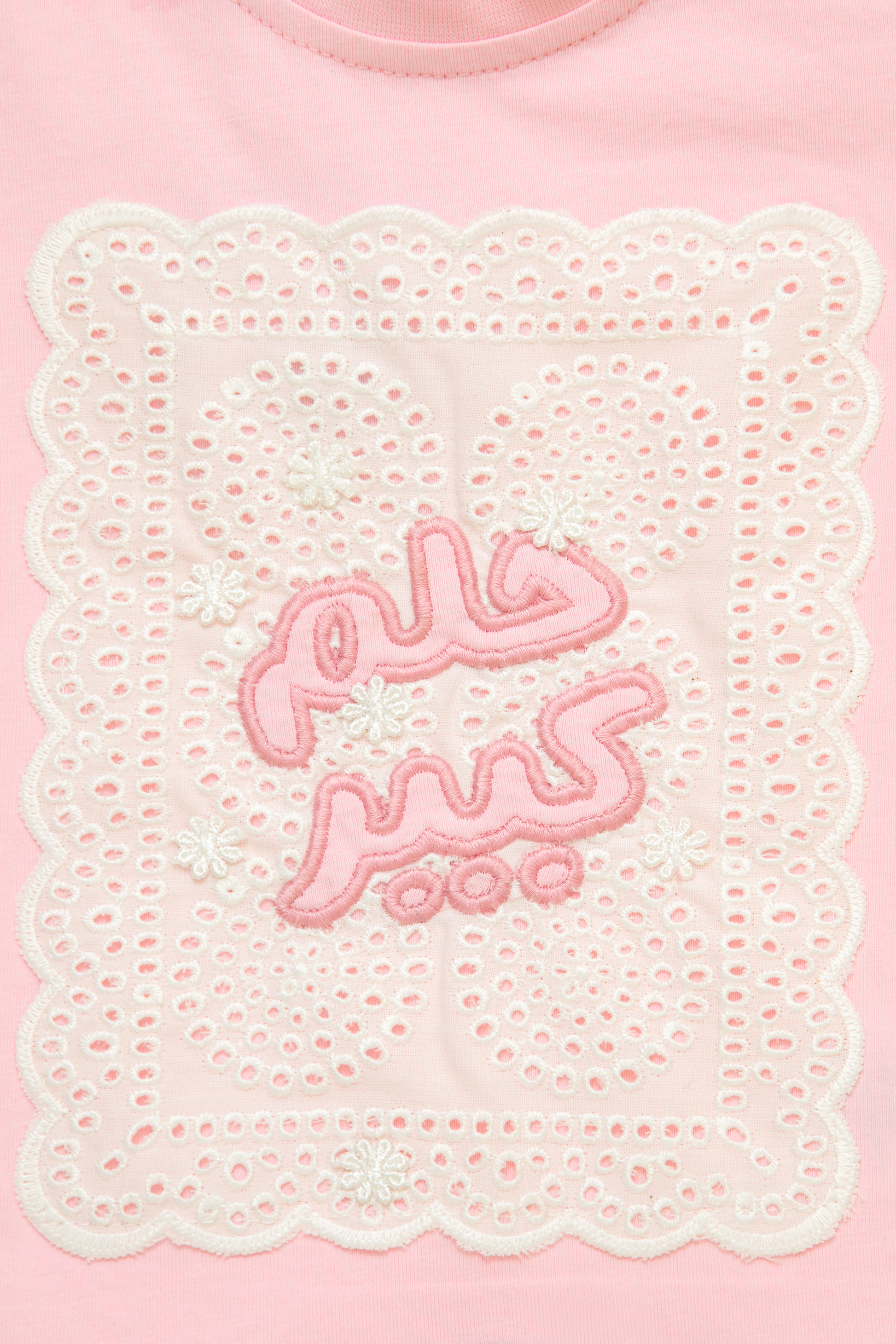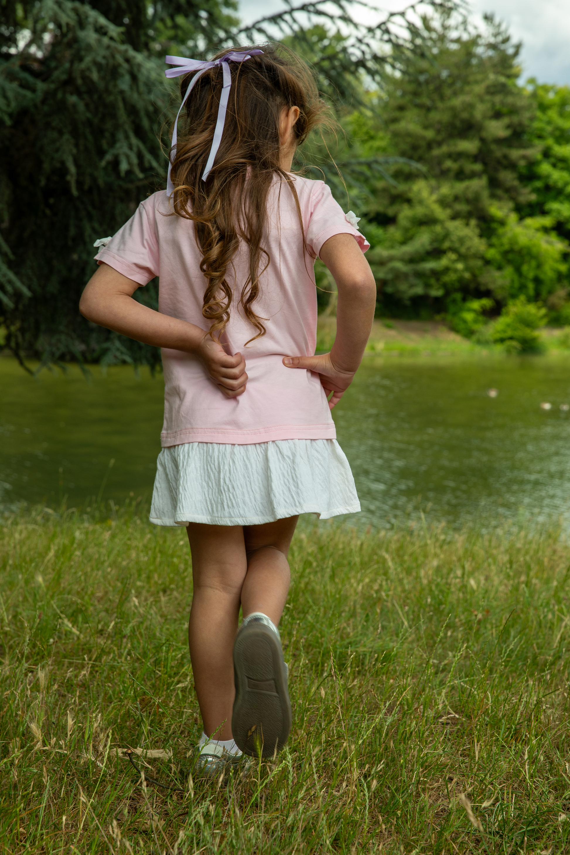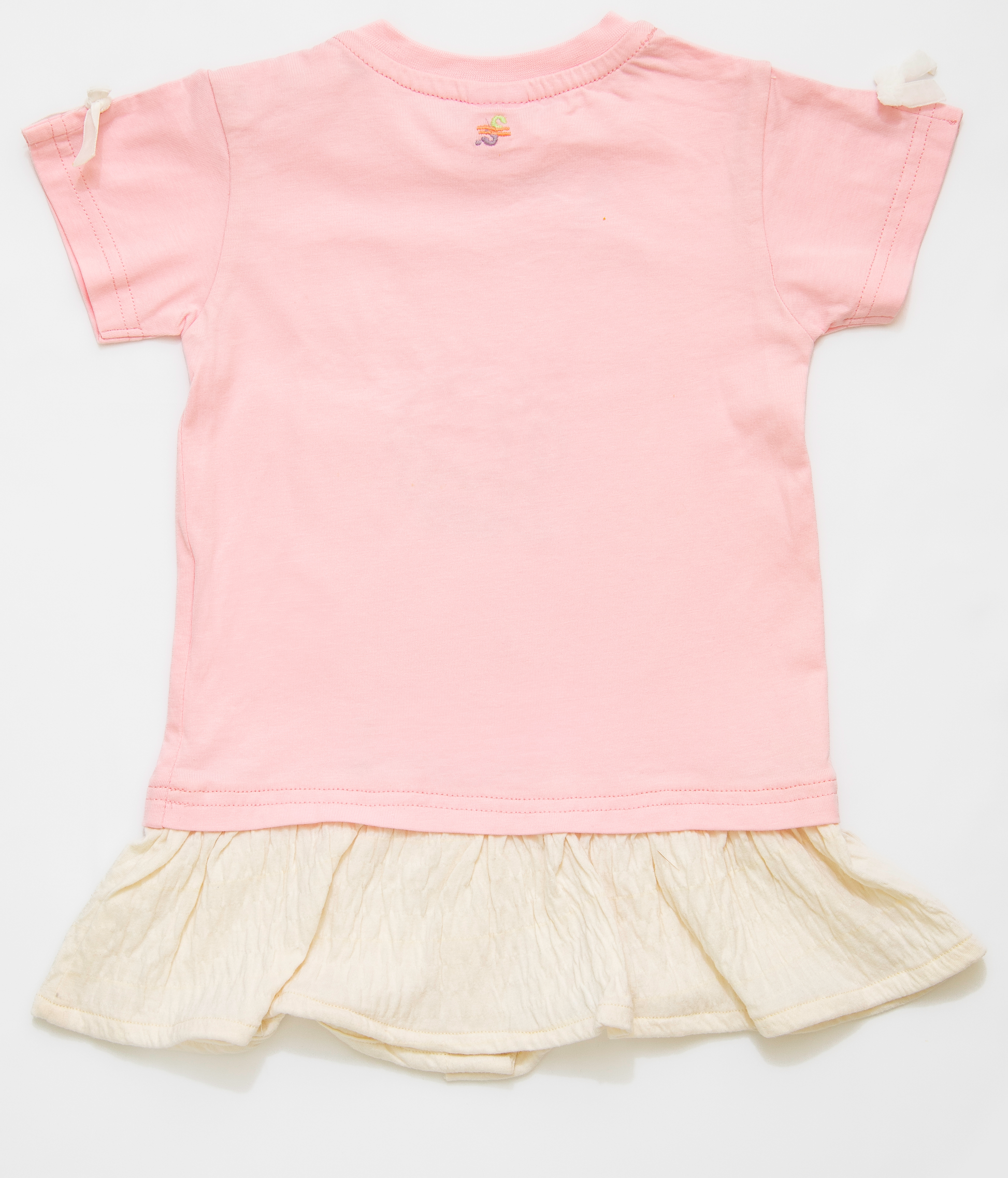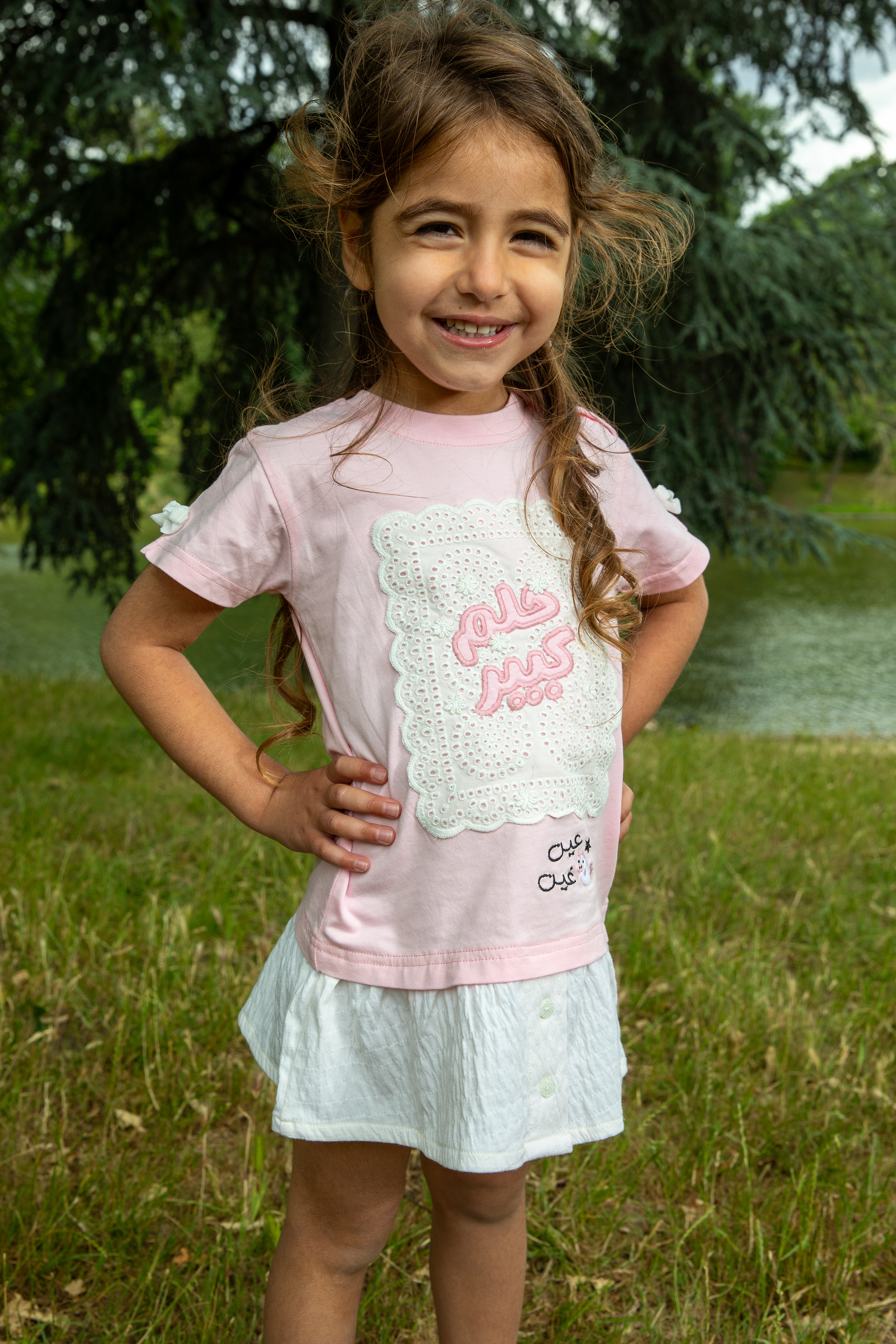 تحفة فنية للصغيرة المدللة! فستان بناتي يجمع بين الفن الراقي والإحساس بالراحة، فهو يتكون من بلوزة جيرسيه علوية ناعمة باللون الزهري، مزودة بكباسات عند الكتف لتسهيل الارتداء، وتنورة متصلة بيضاء من قماش مجعد بملمس فريد وجذاب. تتألق الواجهة الأمامية كلوحة إبداعية، حيث تبرز عبارة "حلم كبير" باللون الزهري المبهج على قاعدة بيضاء من التطريز الإنجليزي المثقب، في حين تتفتح مجموعة من الزهور الجميلة لتمنح التصميم بُعدًا حيويًا وآسرًا. أما الظهر، فيتزين بشعار "عين غين" المطرز. ولإضفاء لمسة من المرح على هذا الفستان الوردي، تزينت فتحات الأكمام بفيونكات مخمل بيضاء لإكمال الطلة. متوفر بمقاسات مختلفة.