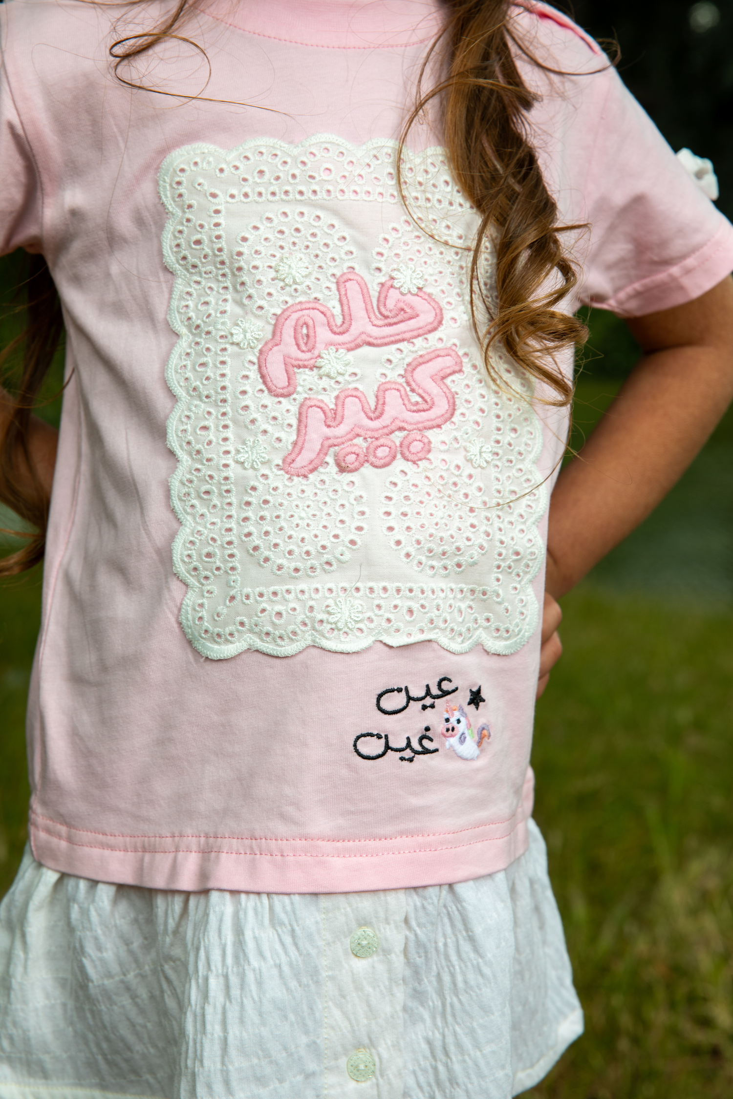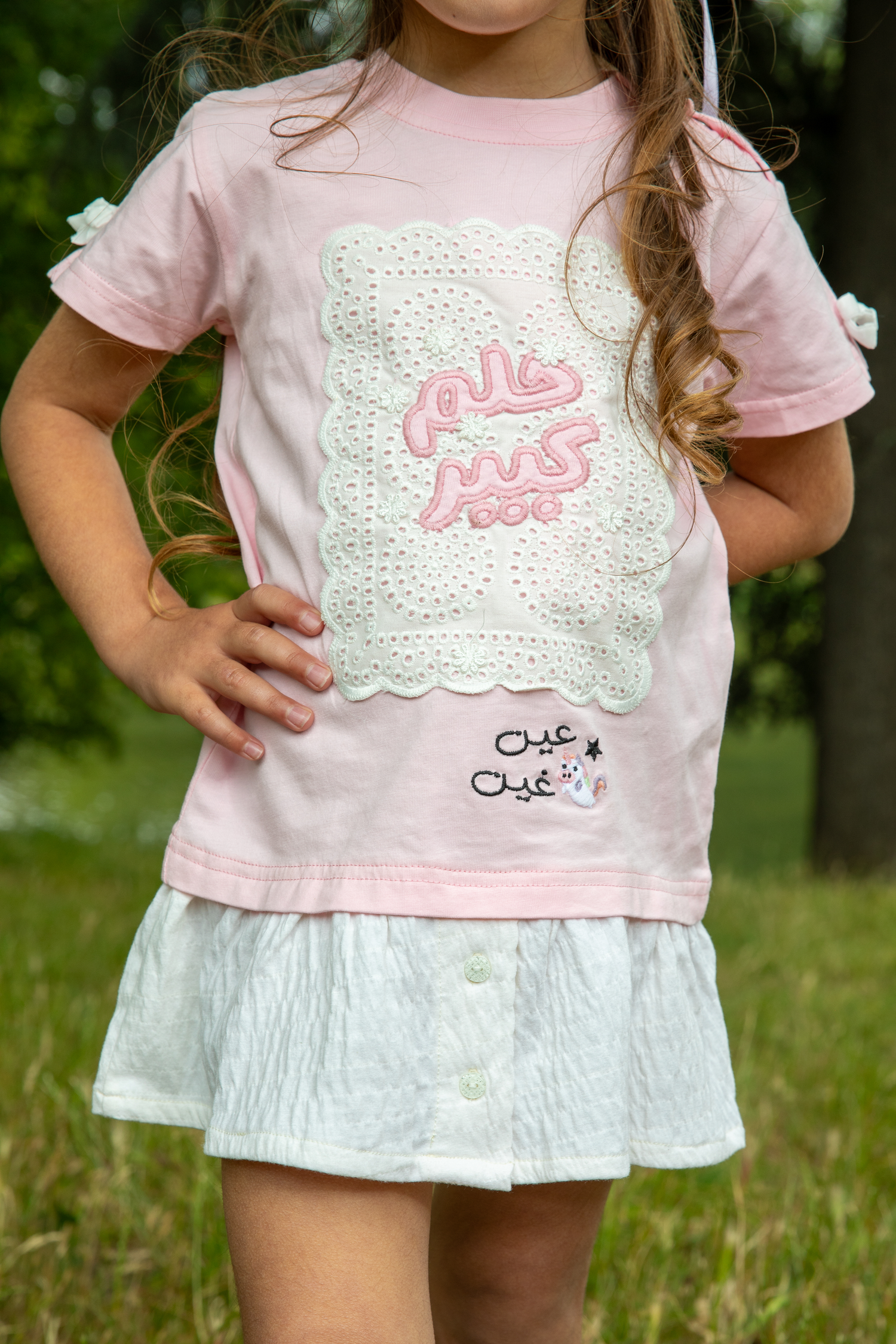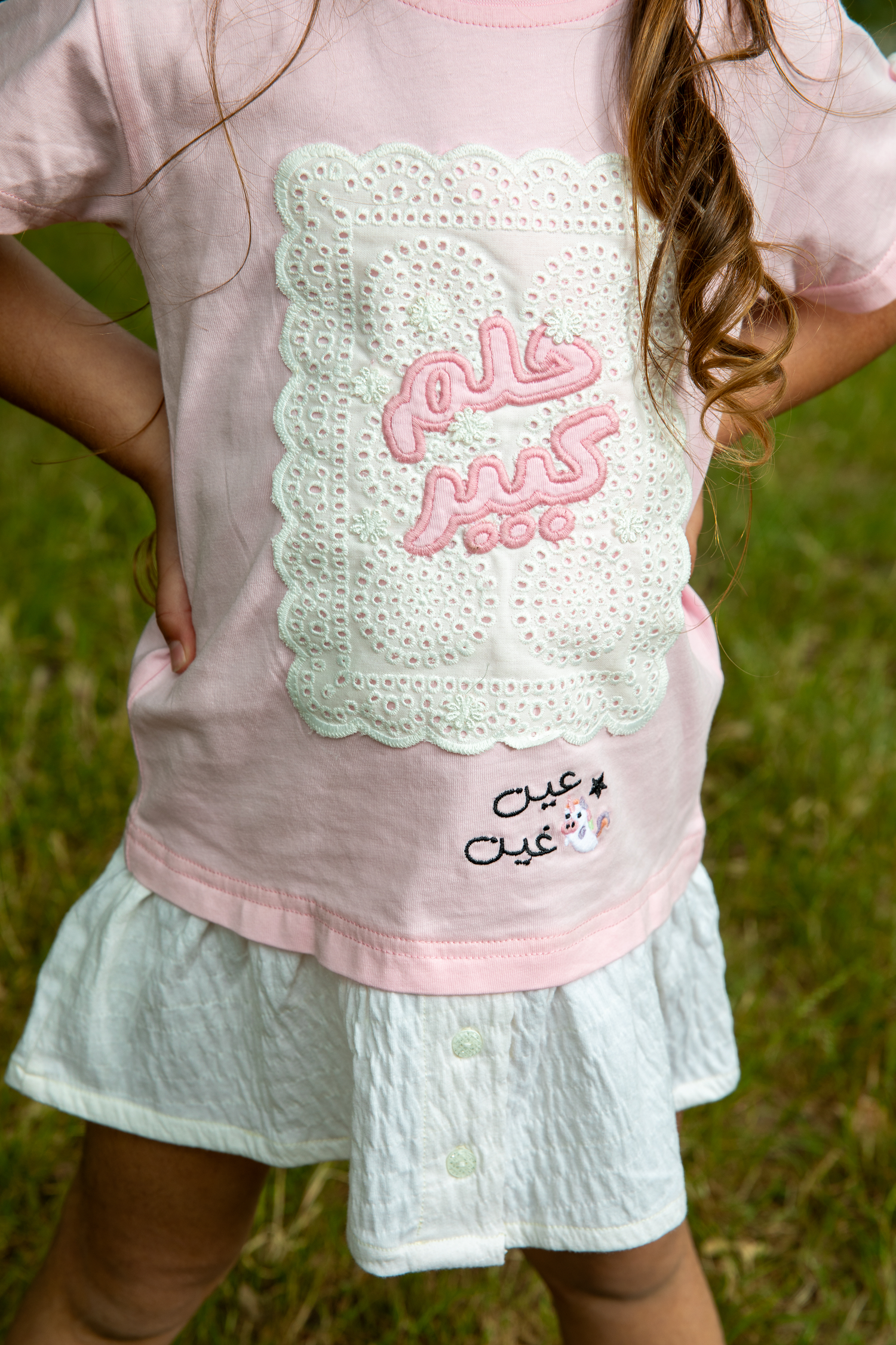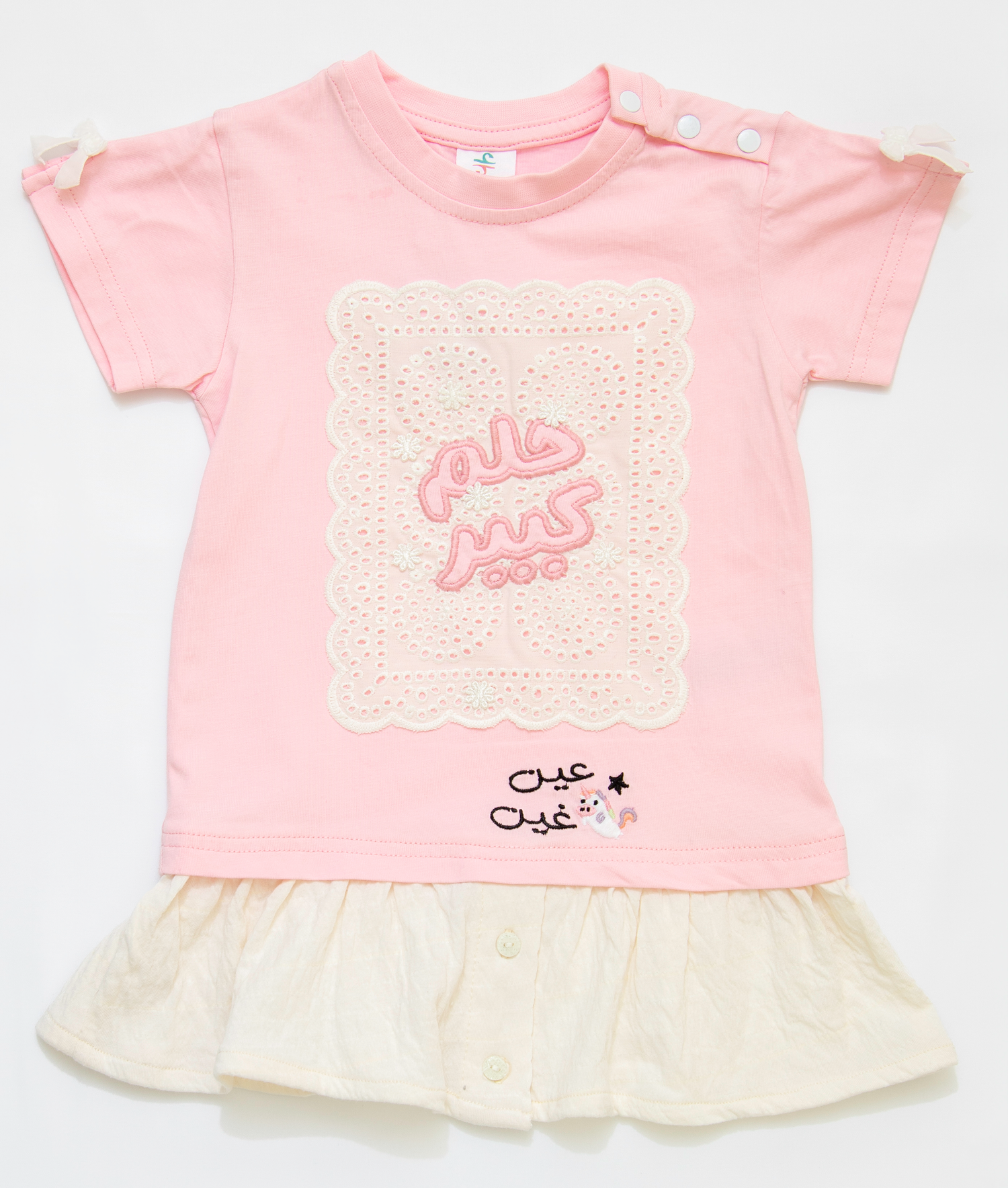 فستان بناتي يجمع بين الفن الراقي والإحساس بالراحة. يتكون من بلوزة جيرسيه علوية ناعمة باللون الزهري، مزودة بكباسات عند الكتف لتسهيل الارتداء، وتنورة متصلة بيضاء من قماش مجعد بملمس فريد وجذاب. تتألق الواجهة الأمامية كلوحة إبداعية، حيث تبرز عبارة "حلم كبير" باللون الزهري المبهج على قاعدة بيضاء من التطريز الإنجليزي المثقب، في حين تتفتح مجموعة من الزهور الجميلة لتمنح التصميم بُعدًا حيويًا وآسرًا. أما الظهر، فيتزين بشعار "عين غين" المطرز. ولإضفاء لمسة من المرح على هذا الفستان الوردي، تزينت فتحات الأكمام بفيونكات مخمل بيضاء لإكمال الطلة.