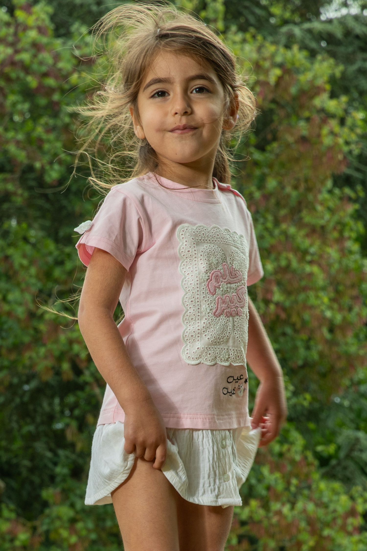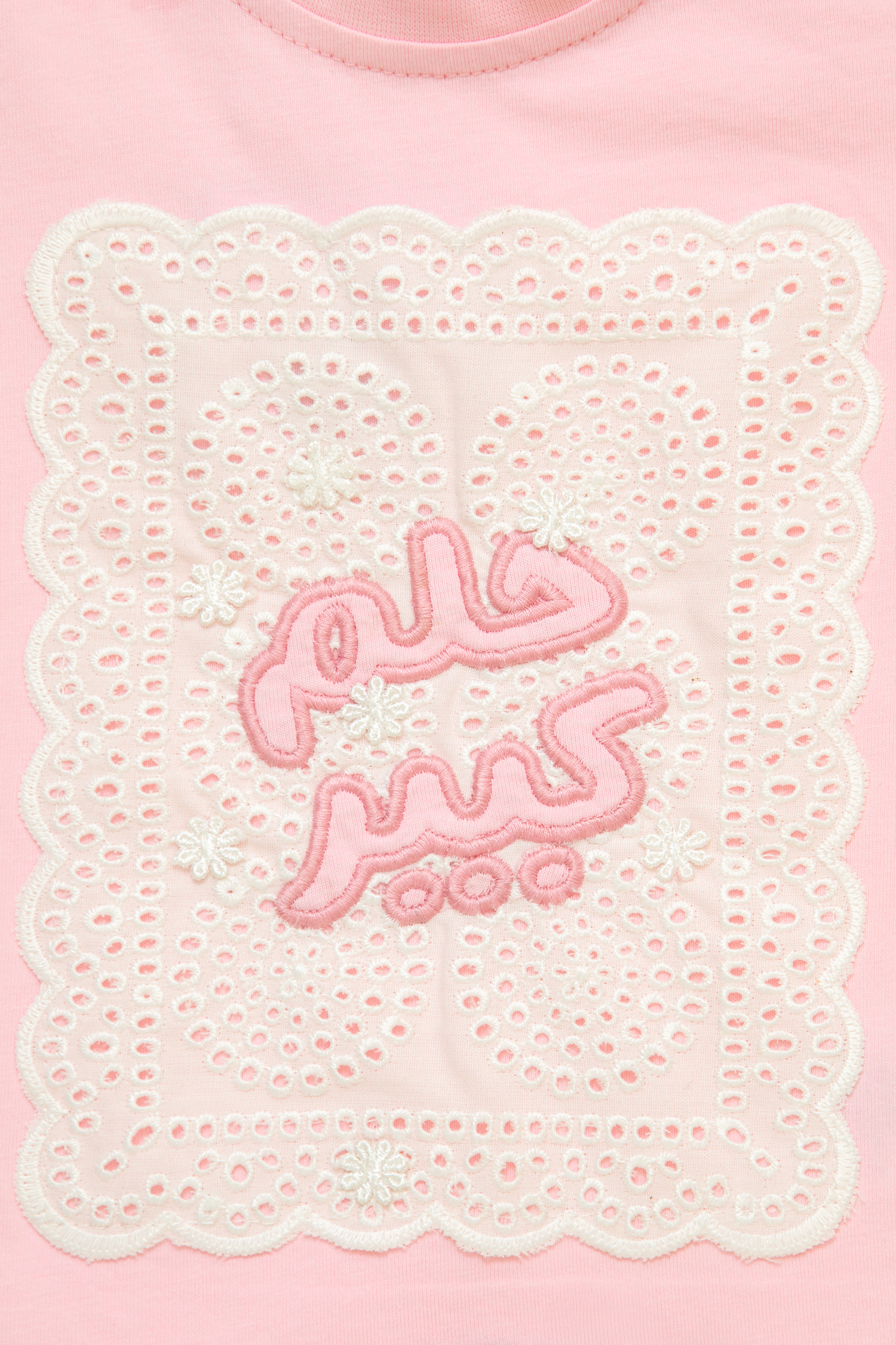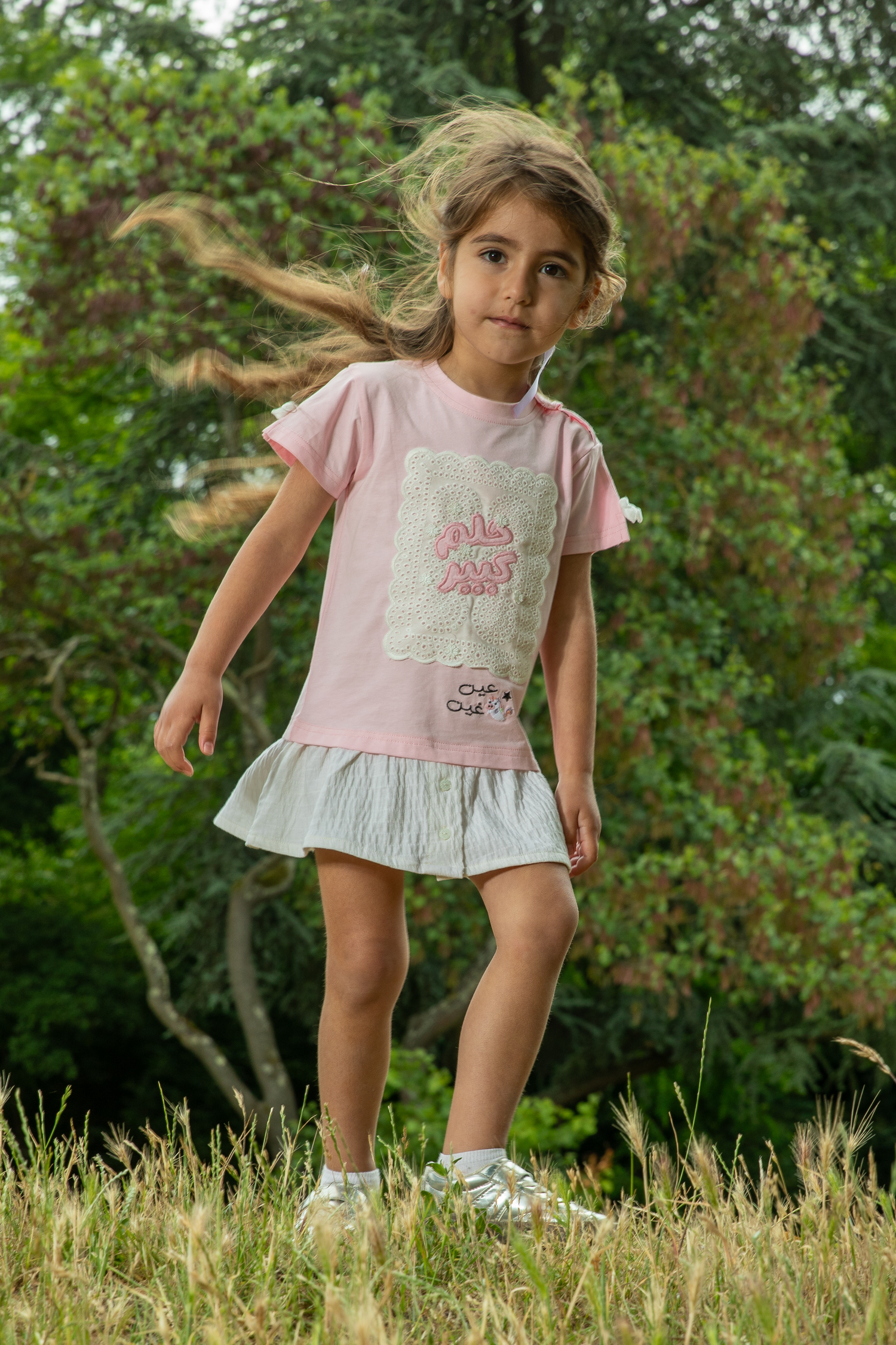 فستان بناتي يجمع بين الفن الراقي والإحساس بالراحة. يتكون من بلوزة جيرسيه علوية ناعمة باللون الزهري، مزودة بكباسات عند الكتف لتسهيل الارتداء، وتنورة متصلة بيضاء من قماش مجعد بملمس فريد وجذاب. تتألق الواجهة الأمامية كلوحة إبداعية، حيث تبرز عبارة "حلم كبير" باللون الزهري المبهج على قاعدة بيضاء من التطريز الإنجليزي المثقب، في حين تتفتح مجموعة من الزهور الجميلة لتمنح التصميم بُعدًا حيويًا وآسرًا. أما الظهر، فيتزين بشعار "عين غين" المطرز. ولإضفاء لمسة من المرح على هذا الفستان الوردي، تزينت فتحات الأكمام بفيونكات مخمل بيضاء لإكمال الطلة.