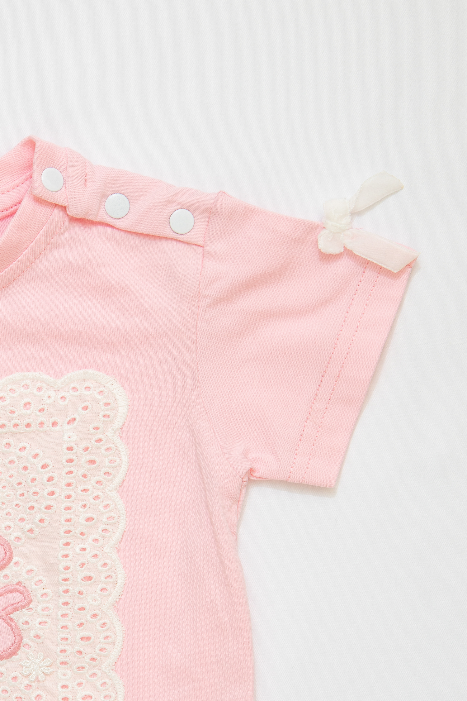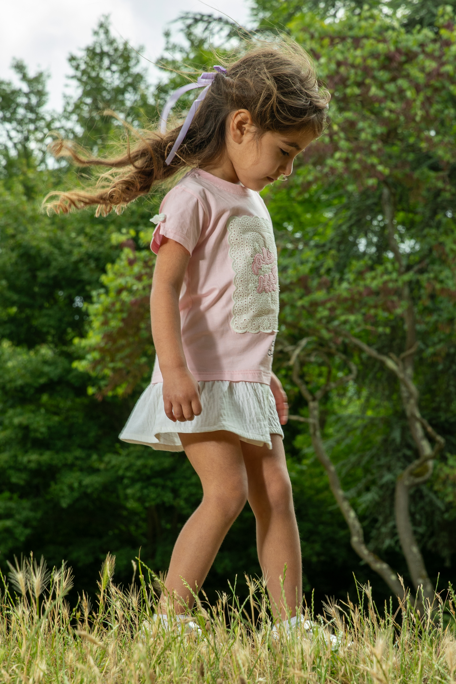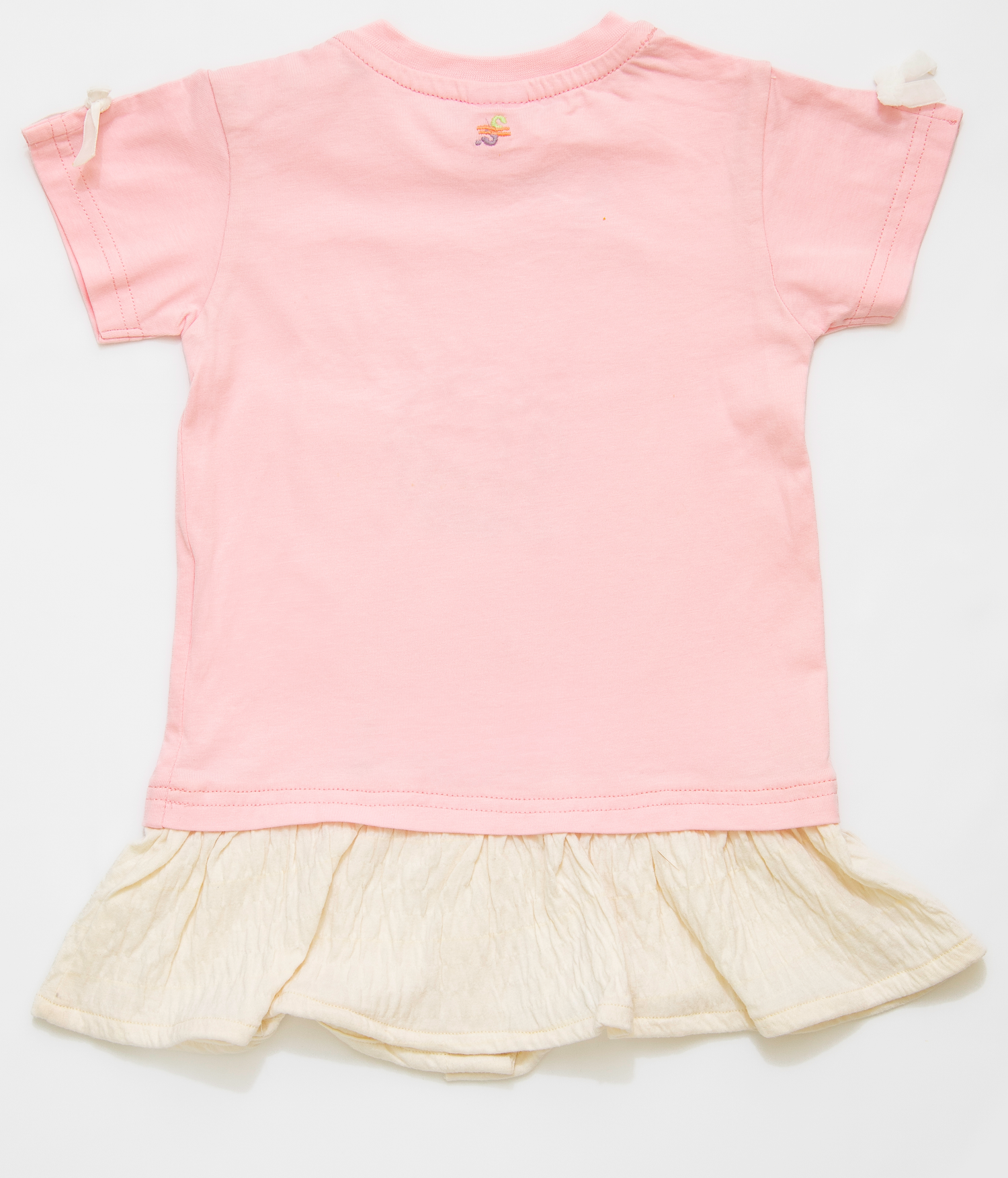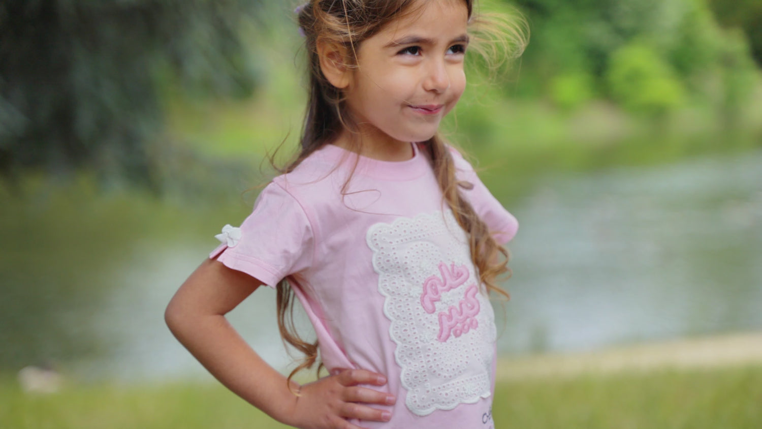فستان بناتي يجمع بين الفن الراقي والإحساس بالراحة. يتكون من بلوزة جيرسيه علوية ناعمة باللون الزهري، مزودة بكباسات عند الكتف لتسهيل الارتداء، وتنورة متصلة بيضاء من قماش مجعد بملمس فريد وجذاب. تتألق الواجهة الأمامية كلوحة إبداعية، حيث تبرز عبارة "حلم كبير" باللون الزهري المبهج على قاعدة بيضاء من التطريز الإنجليزي المثقب، في حين تتفتح مجموعة من الزهور الجميلة لتمنح التصميم بُعدًا حيويًا وآسرًا. أما الظهر، فيتزين بشعار "عين غين" المطرز. ولإضفاء لمسة من المرح على هذا الفستان الوردي، تزينت فتحات الأكمام بفيونكات مخمل بيضاء لإكمال الطلة.