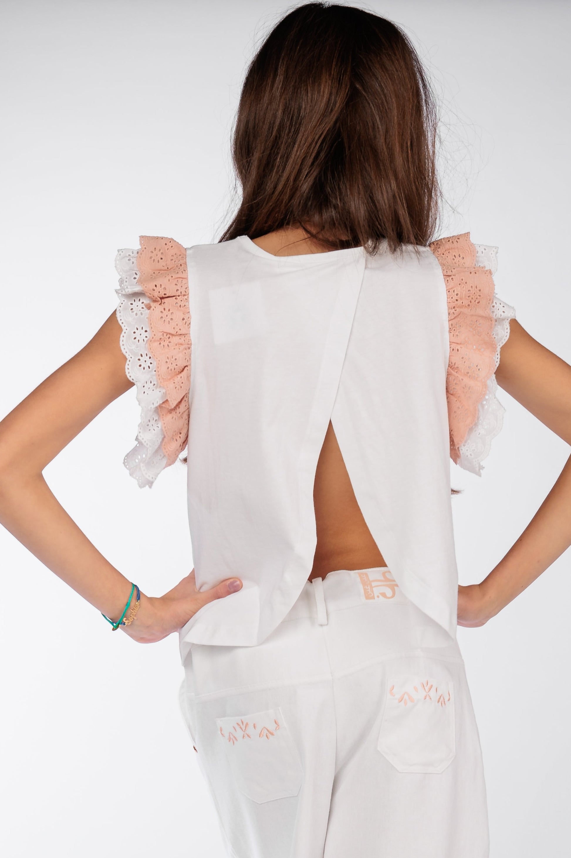 بلوزة بيضاء بصناعةٍ من القطن العضوي المحبوك، راقية وجذابة! تظهر جاذبيتها بتطريز كلمات المقولة والأغنية المصرية الشهيرة "الغزالة رايقة" باللون الورديّ مع إحاطتها بحبات الكريستال الوردية، وظهرها المفتوح وأكمامها البيضاء الوردية المصنوعة من التطريز الإنجليزي المثقّب. تعطي هذه البلوزة مظهراً مختلفاً لا يمكن تفويته! يمكن تنسيق البلوزة بشكل مثالي مع بنطلون "الغزالة" من نفس المجموعة! متوفرة بمقاساتٍ عدة.