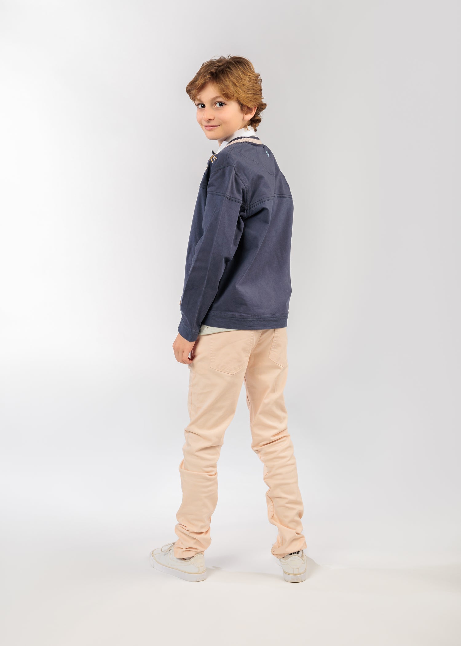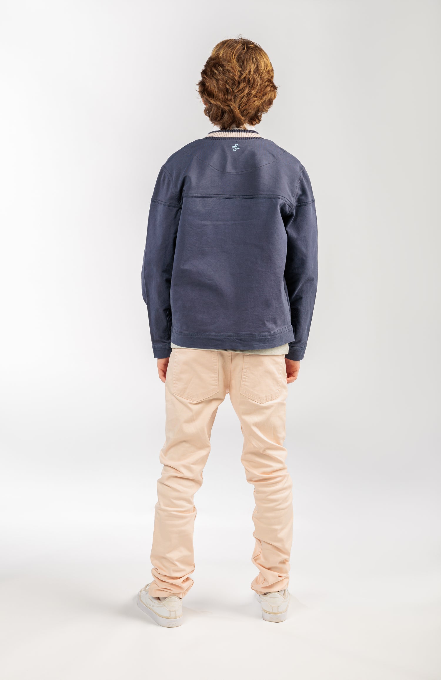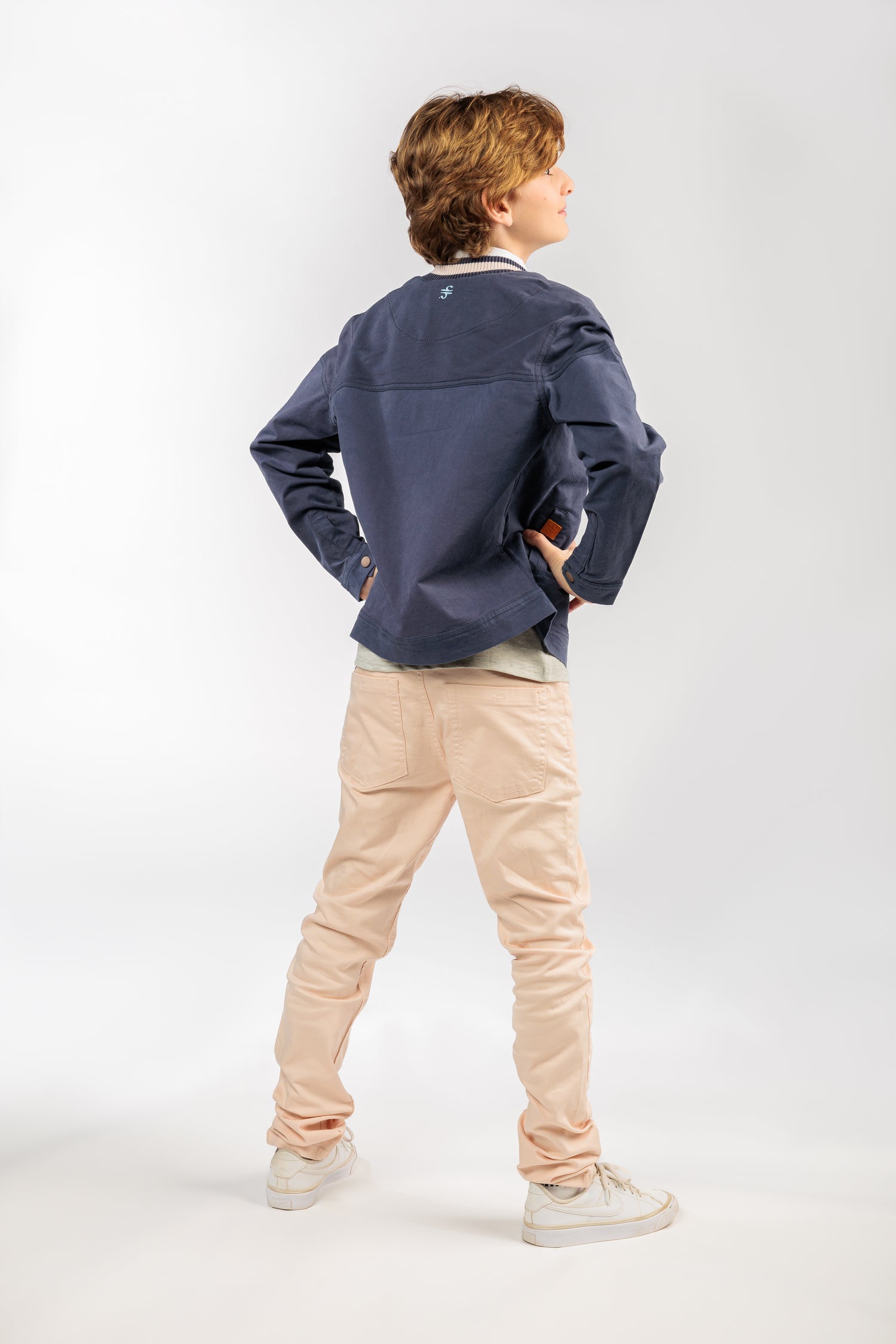 جاكيت أزرق غامق يعكس الجاذبية والهدوء، يعلوه تطريزٌ  من الجنب لكلمات "الهوا بدو خيمة" من أغنية فيروز ليخطف الأنظار ويثير الفضول، مع ياقةٍ مخططة عصرية لتكتمل الإطلالة شبه الرسمية، مصنوع من القطن المصري المزدوج. يمكن تنسيقه مع مجموعة تك تك المميزة! متوفر بمقاساتٍ عدة.