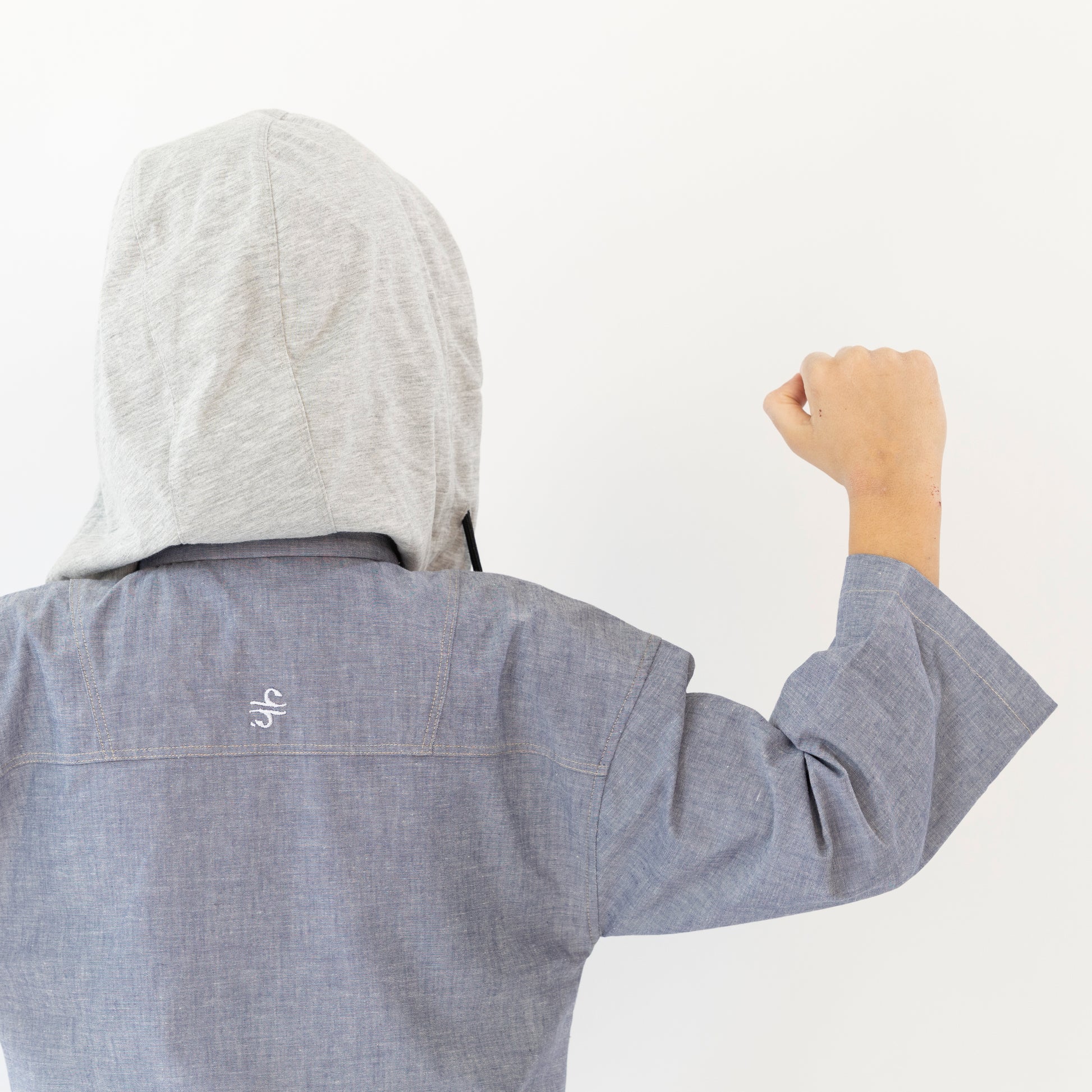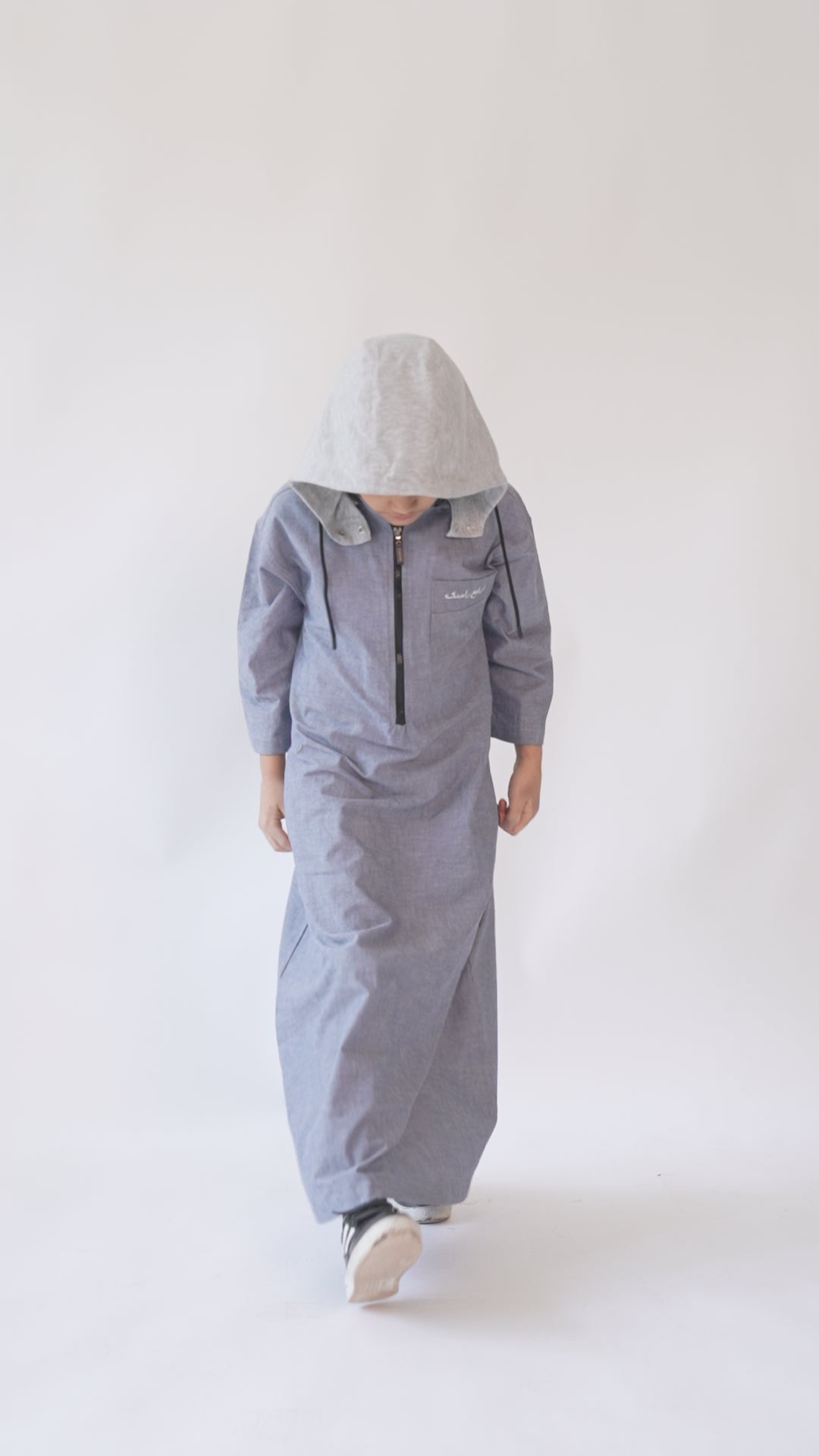 ثوب عصري بتصميم هودي، مصنوع من الدنيم شامبراي الأزرق مع طاقية منفصلة بسحاب مخفي تحت الياقة من قماش ميلانج الرمادي، ومزين بعبارة الفخر والاعتزاز "ارفع راسك". ذلك الشعار الذي يرافق الشاب الصغير في كل خطوة ويمنحه الثقة ليتألق بأسلوبه الخاص ويحتفي بهويته العربية العريقة. هذا الثوب المريح بأكمامه الطويلة والسحاب الأسود من الأمام هو الخيار الأمثل لاستقبال شهر رمضان المبارك. متوفر بمقاسات مختلفة.