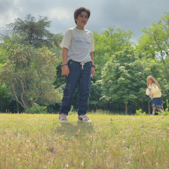 الرفيق الأمثل للبطل الصغير! بنطلون جينز ولادي كحلي مصنوع من الدينيم الخفيف ليوفر للشاب الحماية من كل عثرة. قَصته العصرية الواسعة وعد بالحرية يسمح له بالركض خلف شغفه بلا قيود. أما الجيوب فهي مخبأ أفكاره الكبيرة، في حين ترسم الخيوط البيضاء كل تفصيله في خريطة أهدافه. تلمع ألوان الشعار "عين غين" المطرز كتوقيع منه على كل إنجاز، وكشعلة من التفاؤل تضيء دربه. ولتكتمل مغامرات البطل، يمكن تنسيقه مع تيشيرت ولادي قطن "الحياة والحلم أحلى". متوفر بمقاسات مختلفة.