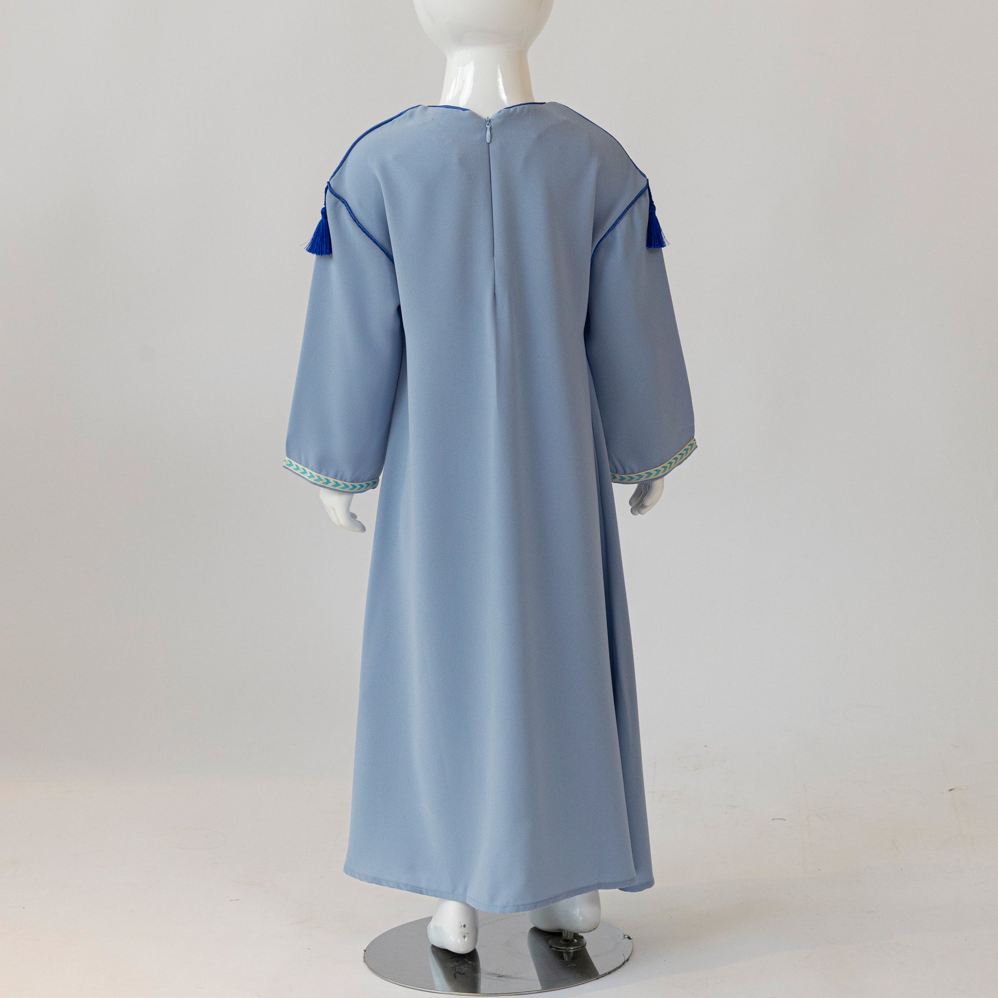 ثوب أزرق من الكريب الساحر، يشع بالأنوثة والقوة والحيوية! يتميز هذا التصميم الانسيابي بطول متوسط وأكمام واسعة مزينة بشريط مطرز وجذاب على الأطراف، مع حزام الخصر الذي يضفي لمسة من الفخامة والدلال.