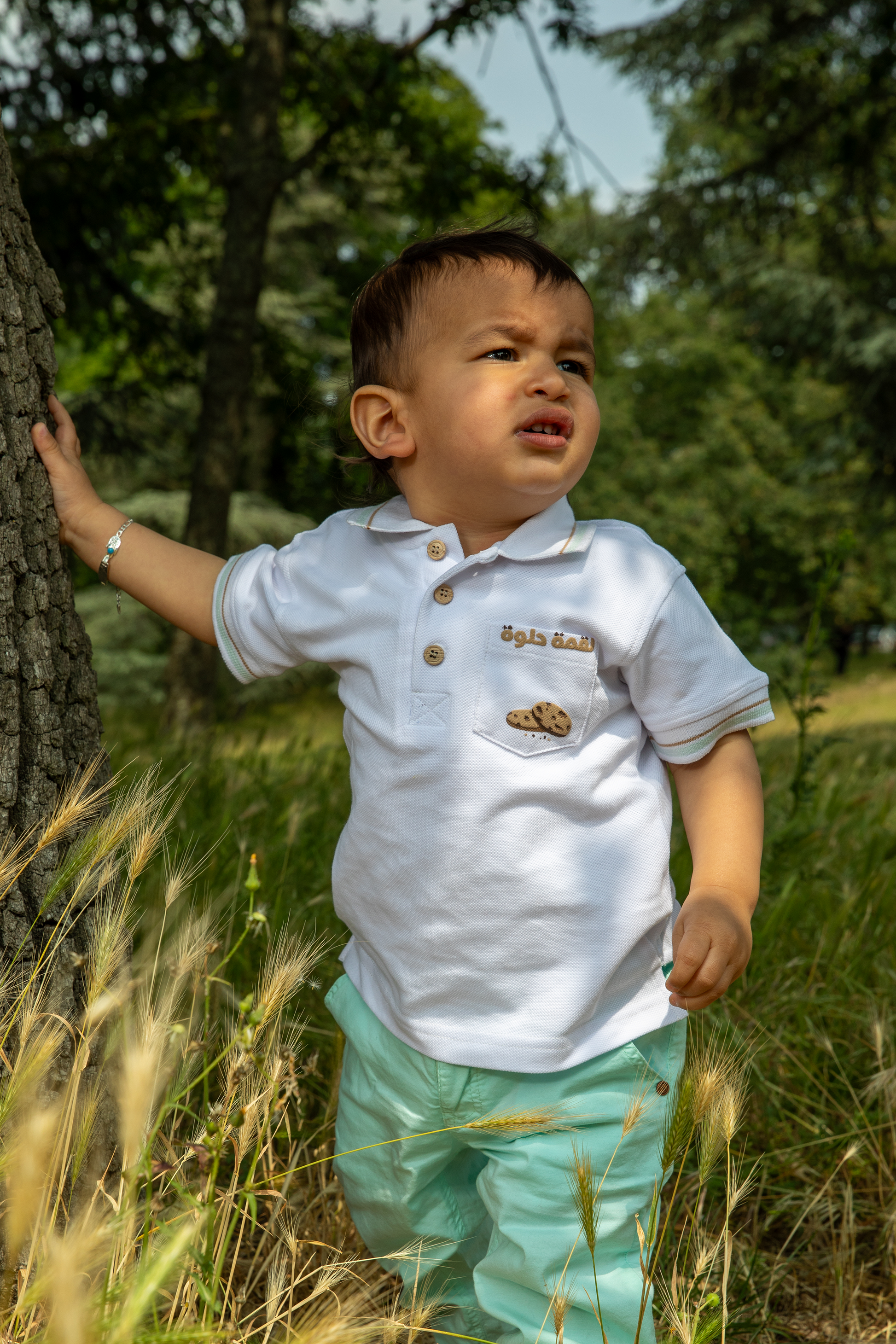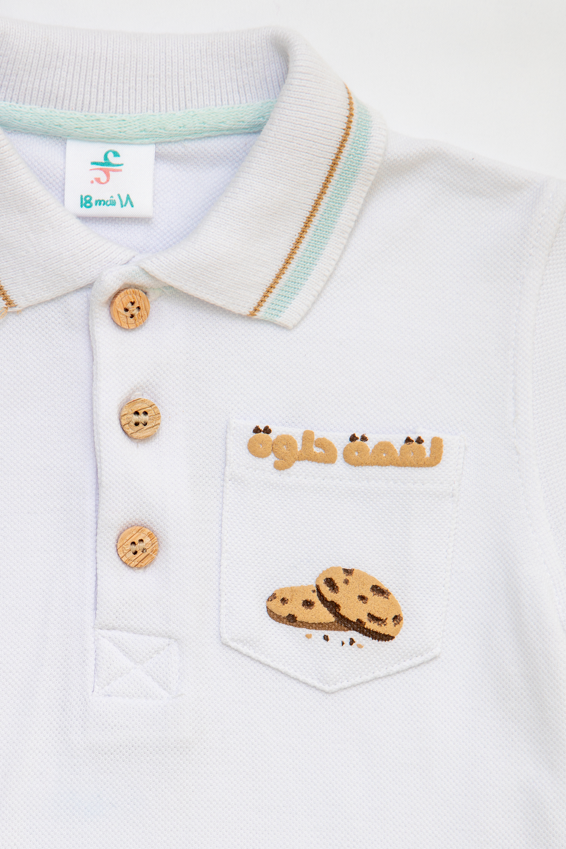 تيشيرت بولو للاطفال يعكس ضحكات الطفولة البريئة وعشق الصغار للحلوى بقطعة كوكي شهية تطل بمرح من الجيب، تعلوها عبارة "لقمة حلوة" بتطريز أنيق. كما تُضفي عليه تلك التفاصيل الكلاسيكية، كالياقة وأطراف الأكمام المحبوكة، لمسة من الأناقة والجاذبية. يمكن تنسيقه مع بنطلون قطن "لقمة حلوة" لإطلالة متكاملة. متوفر بمقاسات مختلفة.