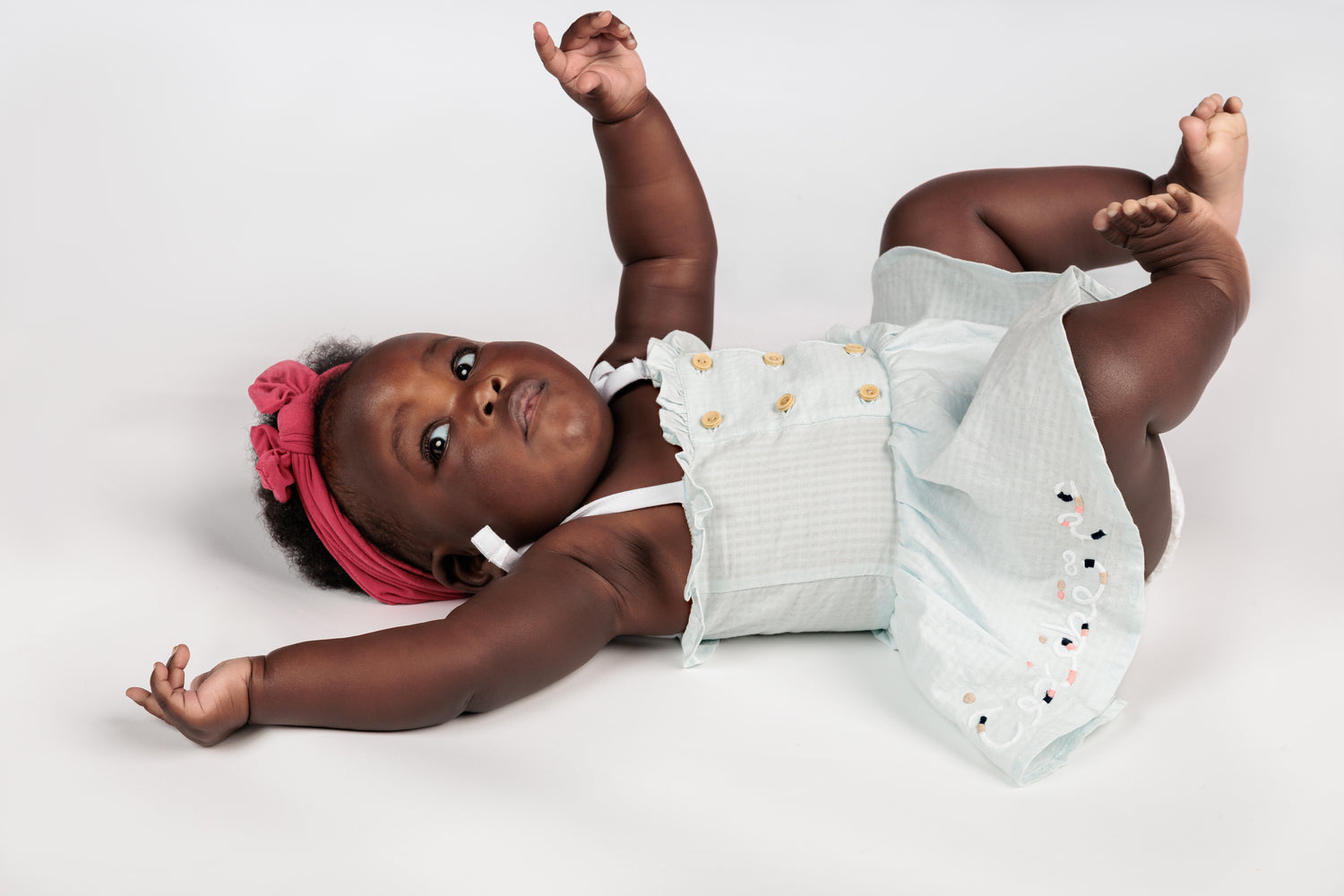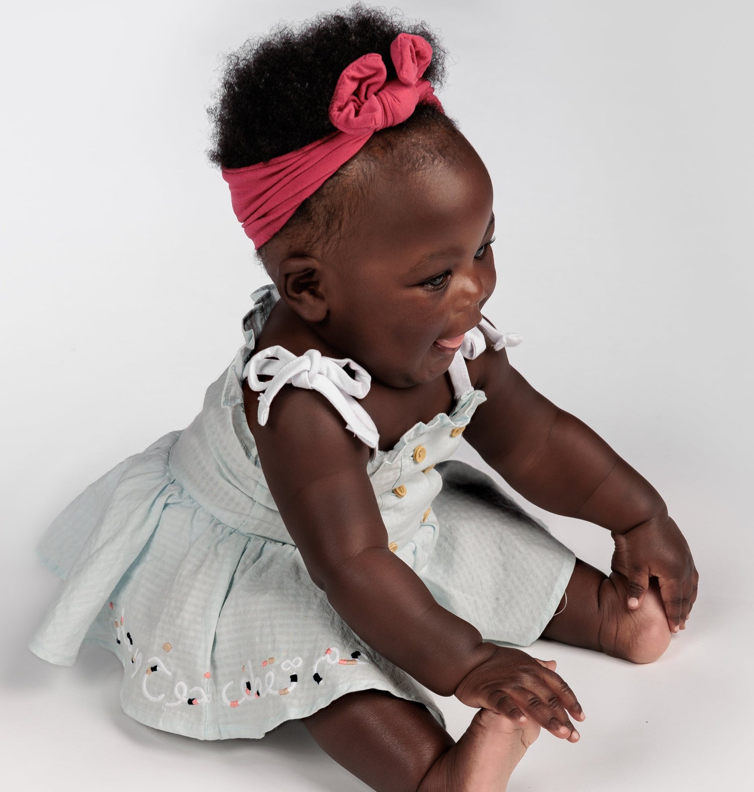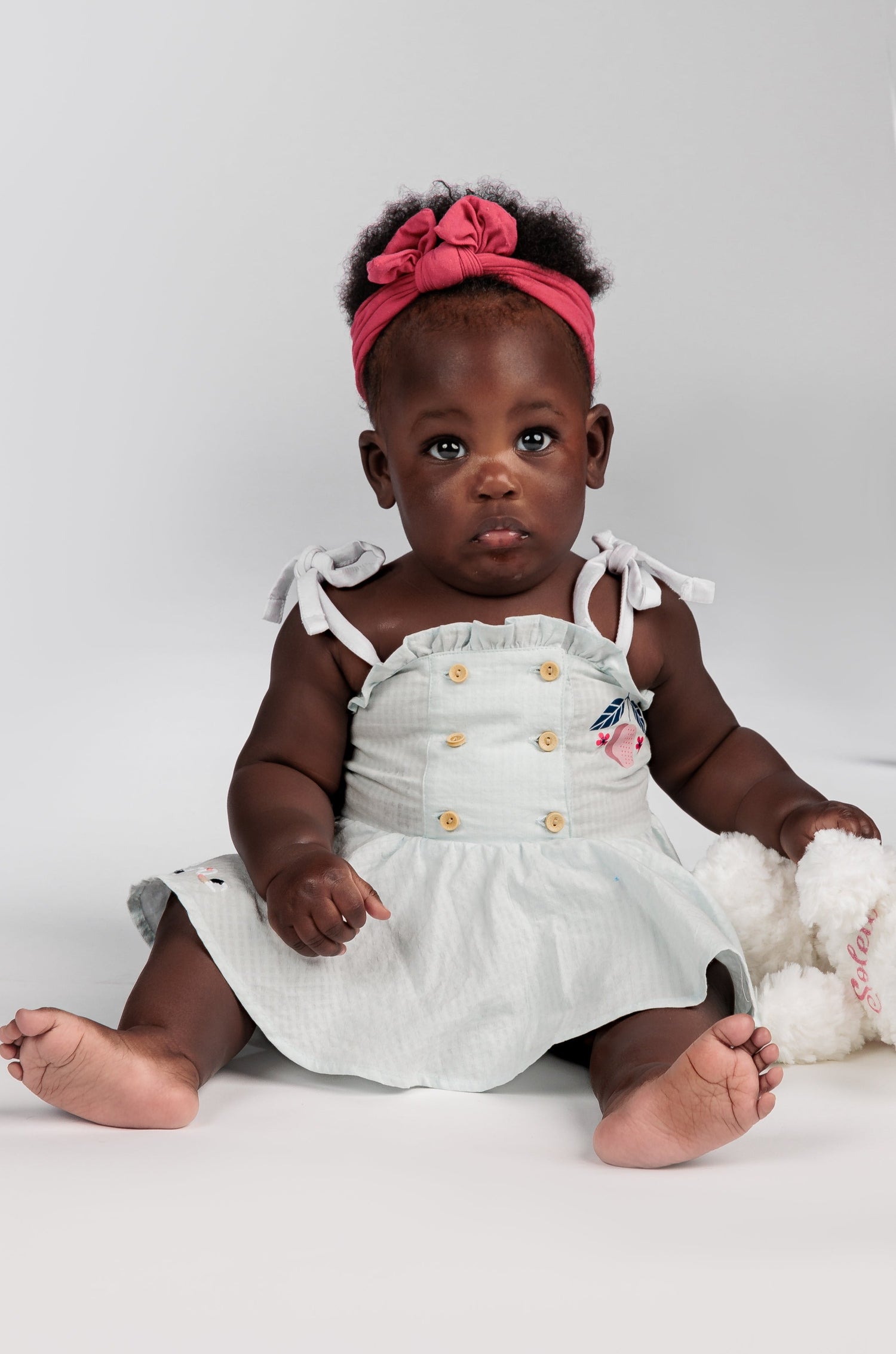 Textured Egyptian cotton, in palest of blue, is embroidered with “She is Picking Plums and Pomegranate” in Arabic at the hem, with both fruits printed to the side of the chest, making this an elegant dress with a touch of whimsy. A touch of Lycra adds comfort and ease.