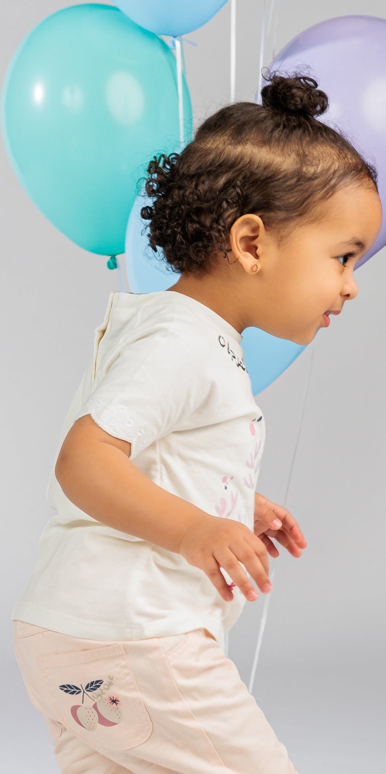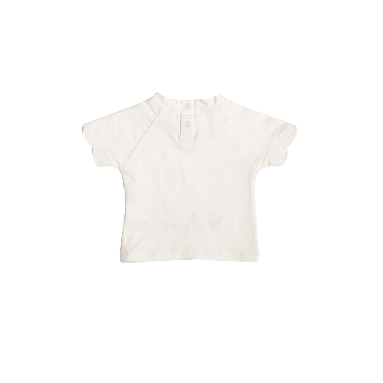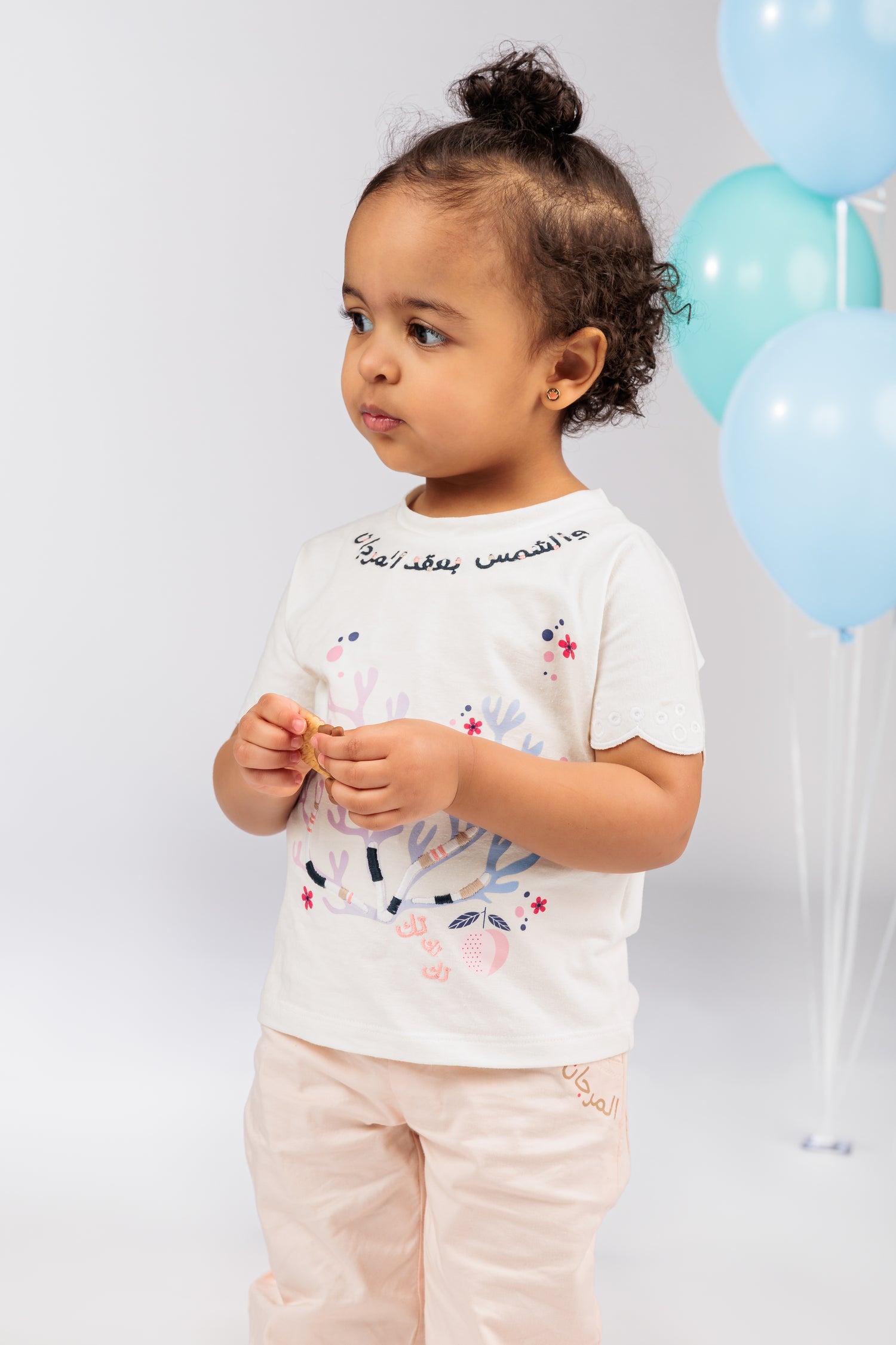 Intricate coral and peach embroidery bring a touch of the folklore of Fairuz to this sweet tee with scalloped sleeves. Made of Egyptian cotton and Lycra for comfort. Coral and peach embroidery and appliqué patterns. Paired with Merjan pants to complete the look.