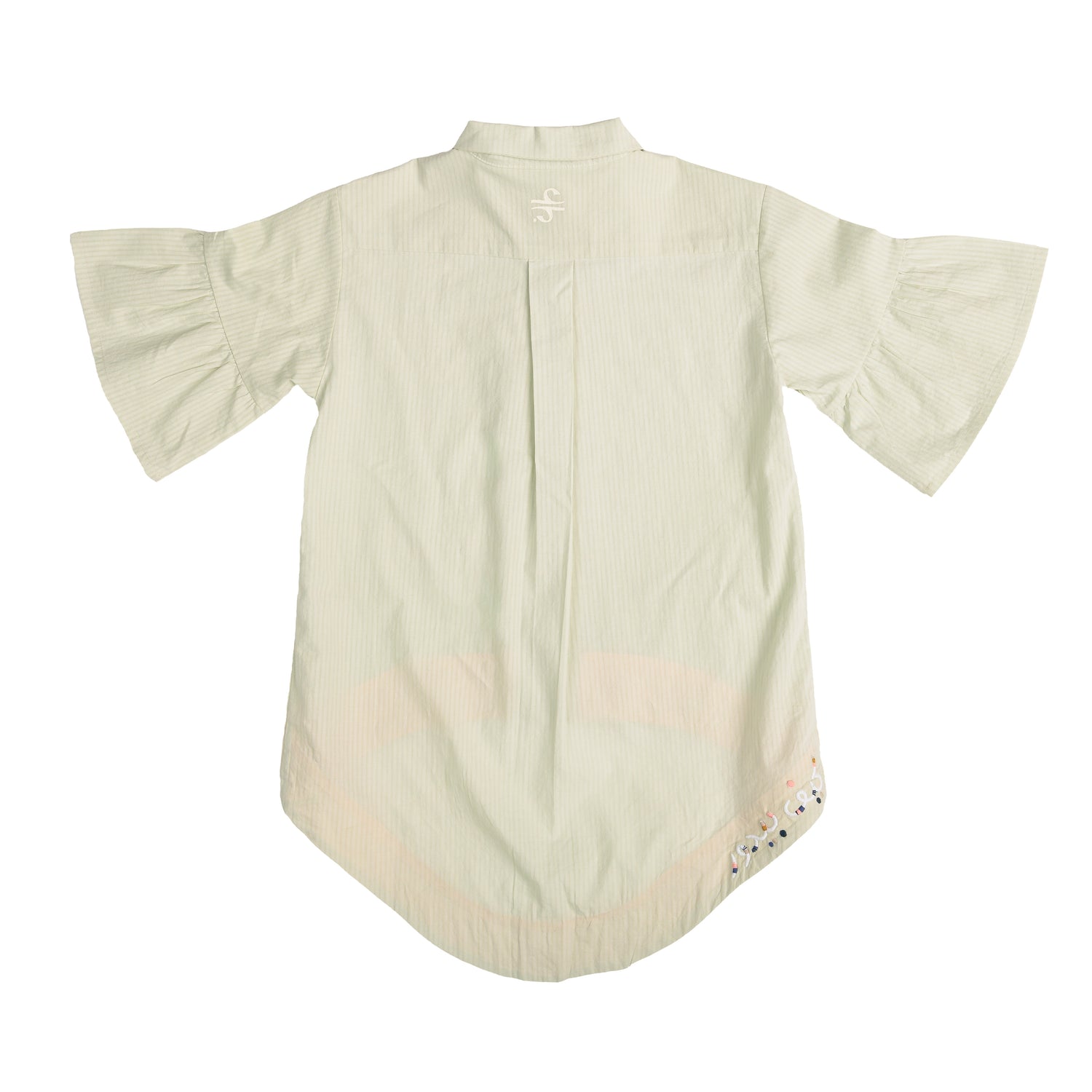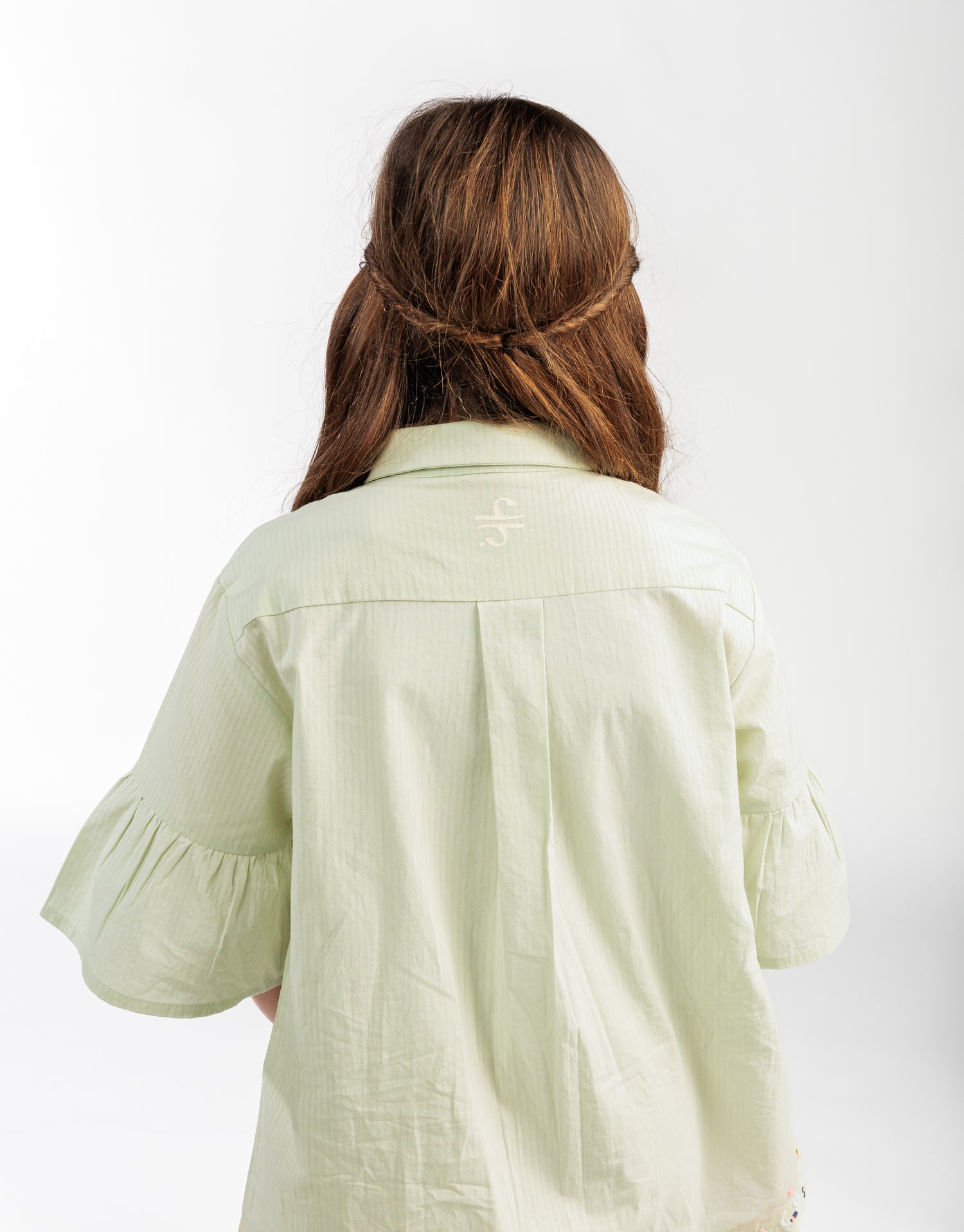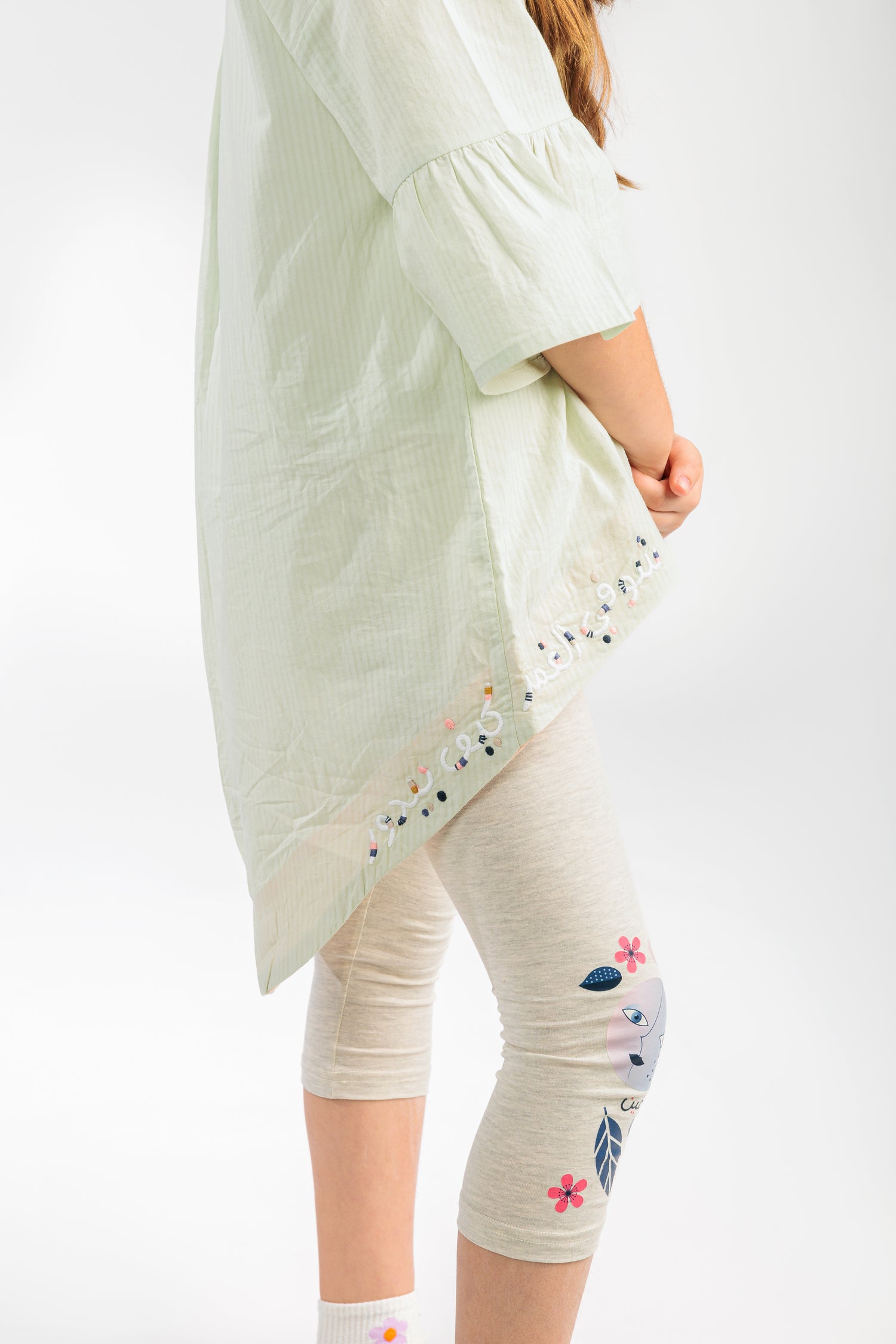 An elegant, oversized shirt dress with longer back, crafted from Egyptian cotton woven fabric in pastel green. Embroidered with "Look at how the moon turns", offering a regal look for the little lady!