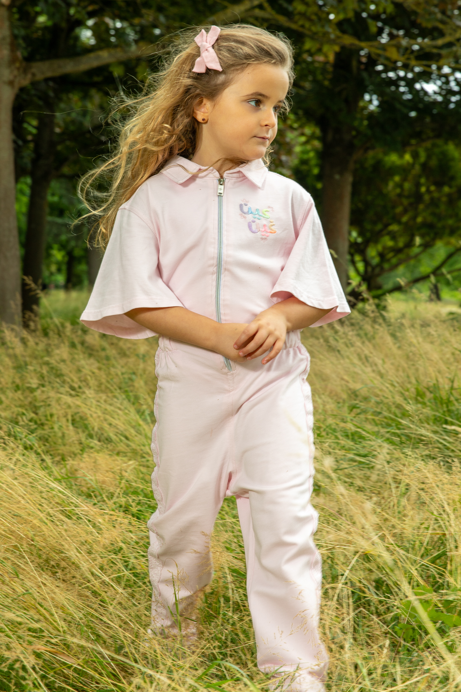 Color: Pink, multi-colored embroidery