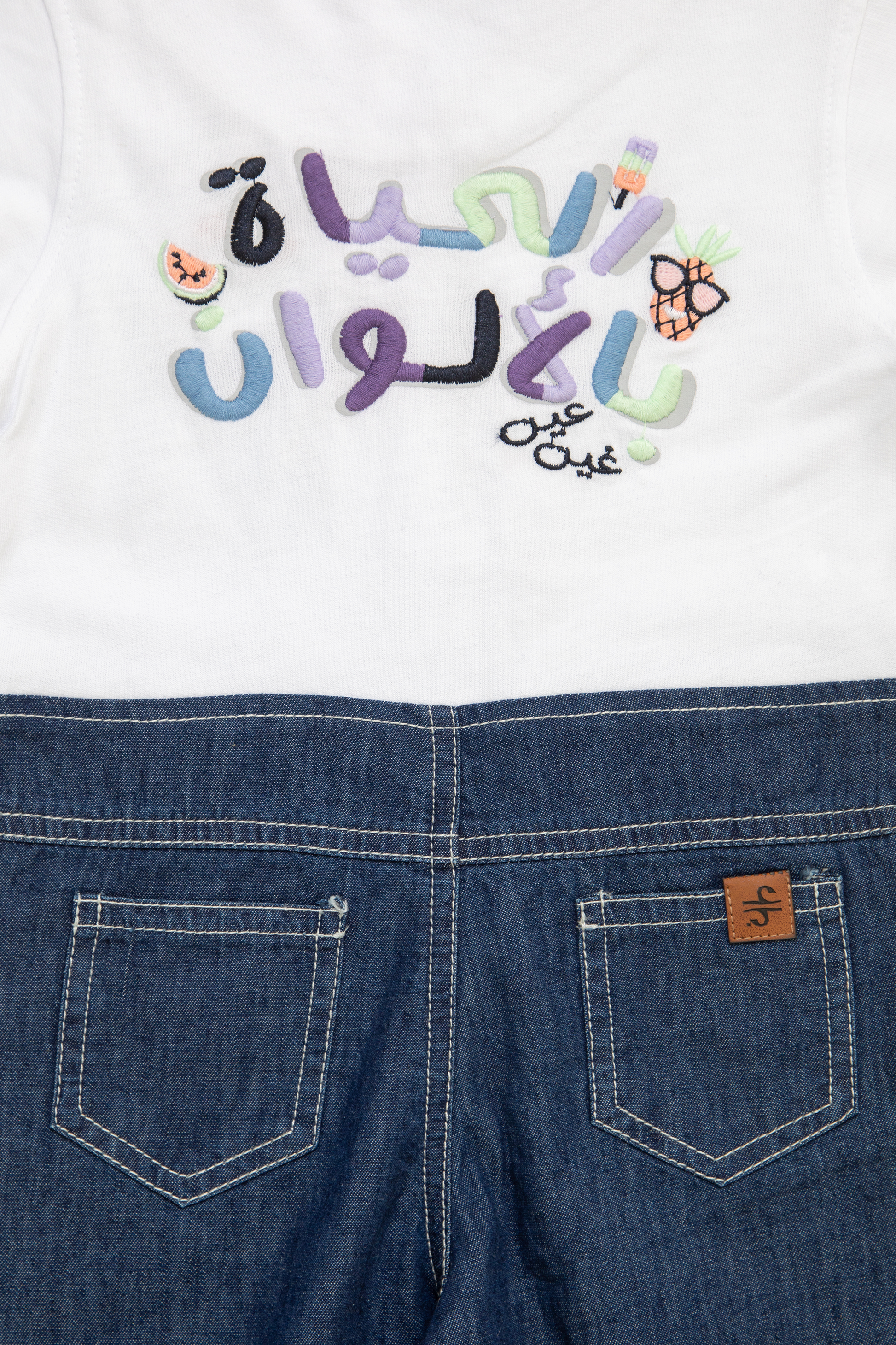 A Denim Overall for little boys with colors of joy! The hooded top, crafted from organic cotton, features a whimsical denim pocket overflowing with embroidered life treats, featuring a practical silver front zipper for easy wear. The back celebrates the "Life in Colors" motto, while the comfortable denim pants ensure freedom for every adventure, highlighted by chic white details. For cooler evenings, pair this cotton overall with the Baby Boy Retro Jacket to complete the look. Available in various sizes.