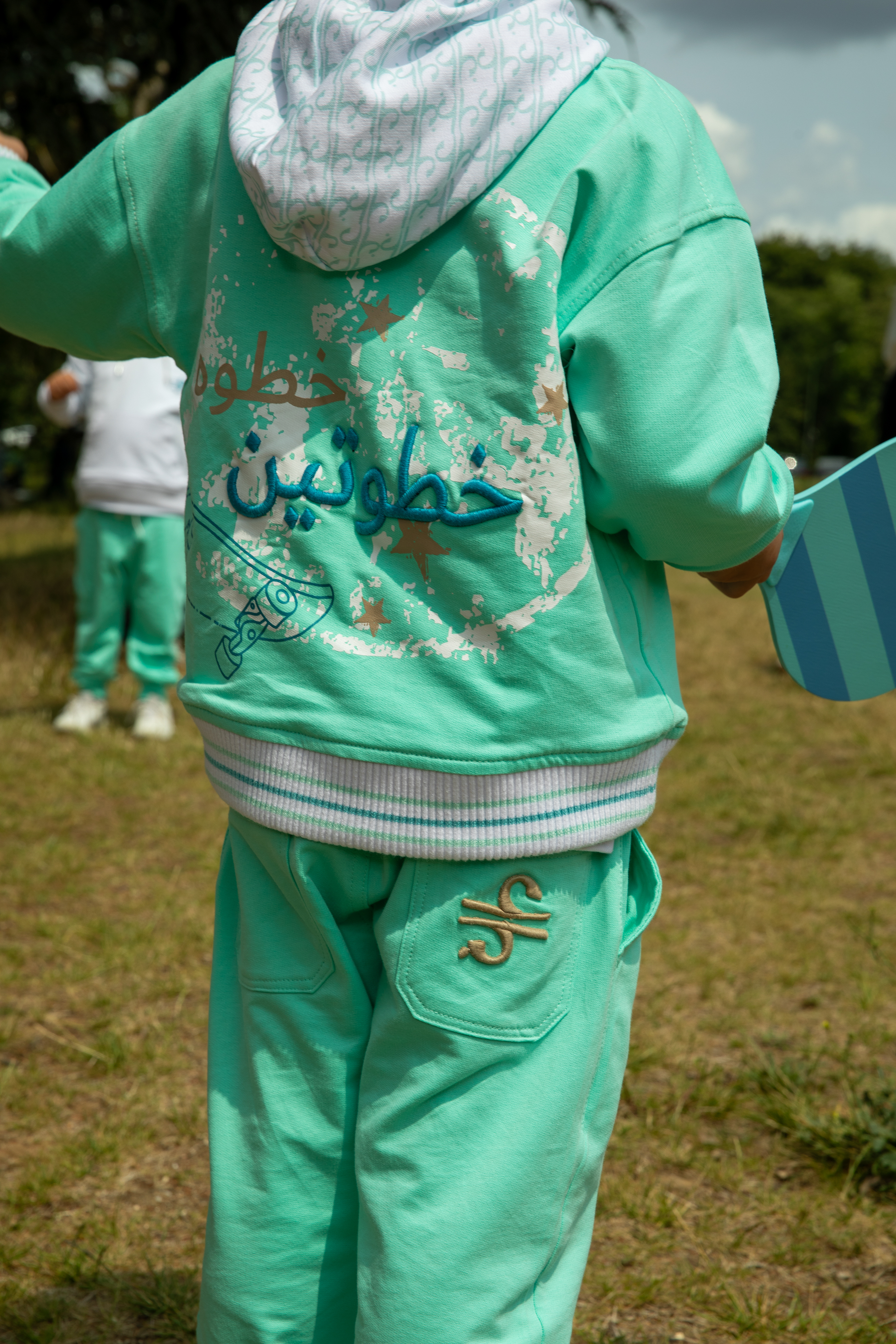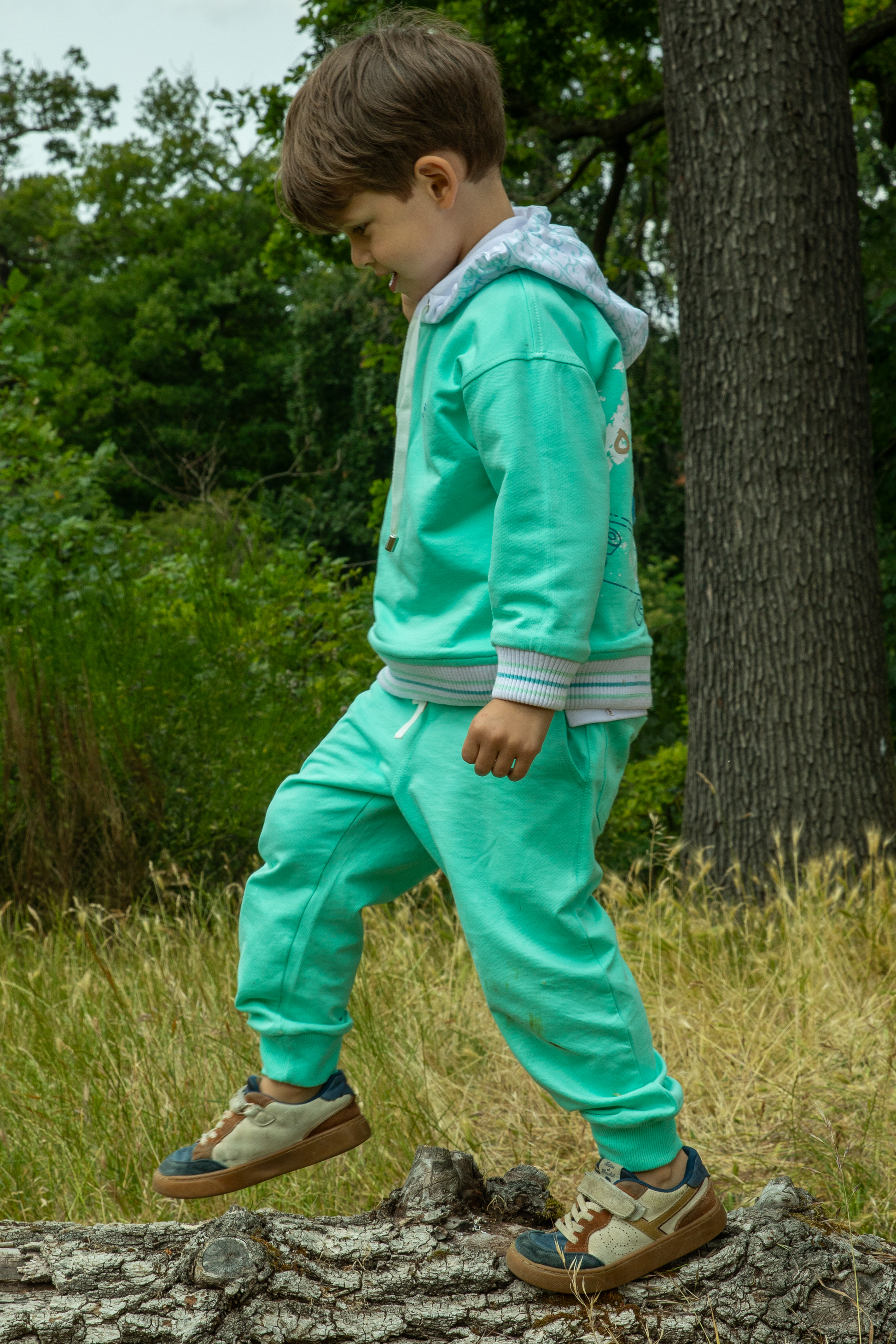 Boys Hoodie for the young hero who knows success is a balance of action and planning! This smart reversible design offers two distinct sides, each with its own purpose. The mint green side, with its "Step by Step" motto, fuels his drive. When it's time to plan, he can flip to the calm white side. Crafted from 100% organic cotton, this hoodie delivers all day comfy style and keeps him ready for anything. The "Ein Ghein" logo pattern on the hood serves as a secret reminder of his unique power. For a complete look, pair it with any basic boys pants, our Gentle Boys Jogger Pants, Legend sweatpants, or the Ein Ghein Denim Boys Pants. Available in multiple sizes.