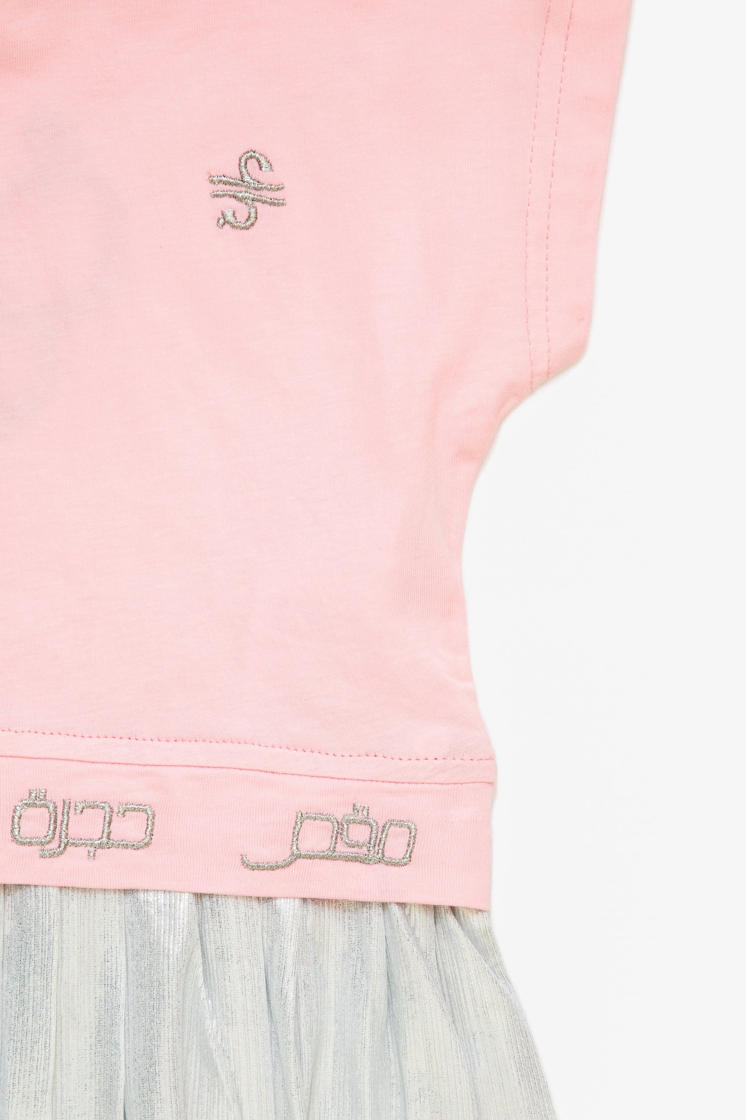 Sparkling cotton pleated dress with a sense of childhood joy! This marvelous piece blends a soft pink jersey top with a dazzling metallic silver plissé skirt for a unique layered look. The true charm comes in the 'Rock Paper Scissors ' embroidery along the top hem as a nostalgic wink to carefree childhood games, laughter, and spontaneous fun. Featuring the artistic scissors on the back makes this pleated dress the ideal choice for the creative girl who lights up a room and carries the happy memories of playtime in her heart. Available in multiple sizes.
